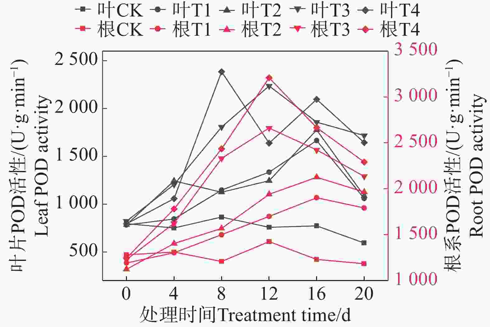 矮蕉幼苗根系的POD活性也随盐胁迫浓度增大呈先上升后下降的趋势。第16天时,T1和T2处理达到最大值,分别为1 902.35 U·g−1·min−1和2 124.80 U·g−1·min−1;T3和T4处理在第12天达到最大值,分别为2 662.05 U·g−1·min−1和3 209.07 U·g−1·min−1。这表明盐胁迫可能提高矮蕉幼苗的POD活性,且高浓度盐胁迫下,POD活性峰值出现的时间早于低浓度处理。相比之下,根系POD活性变化较为平缓,多呈单峰或平缓上升模式;而叶片POD活性波动更为剧烈,出现双峰现象。在后期,两者的POD活性均有所下降,但叶片活性回落更明显,根系回落相对较小。