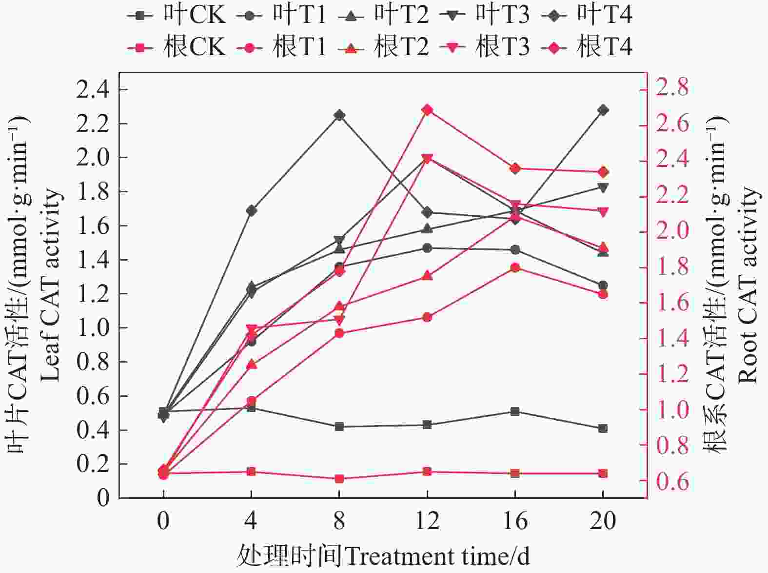 对于矮蕉幼苗根系的CAT活性,随着盐胁迫浓度的增大,各处理均呈现先上升后下降的趋势。T1和T2处理在第16天达到最大值,分别为1.80 mmol·g−1·min−1和2.09 mmol·g−1·min−1;T3和T4处理在第12天达到最大值,分别为2.42 mmol·g−1·min−1和2.69 mmol·g−1·min−1。结果表明,盐胁迫可能提高矮蕉幼苗的CAT活性,且高浓度盐胁迫更能刺激CAT活性达到较高峰值。在盐胁迫条件下,根系的CAT活性高于叶片,且上升速度更快。