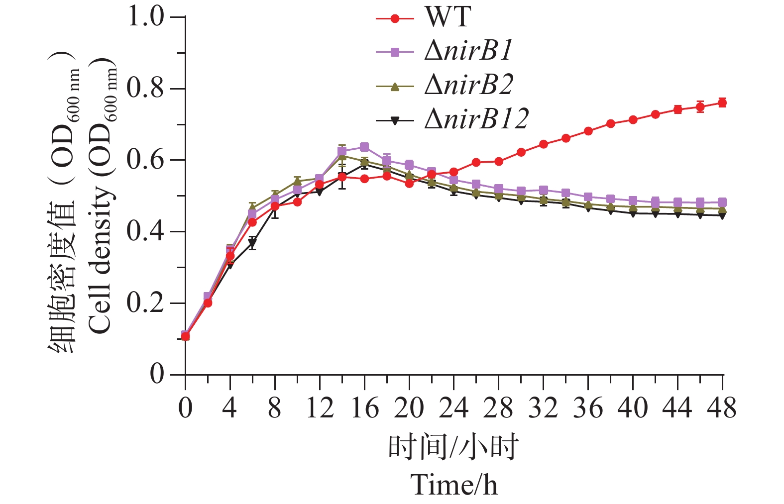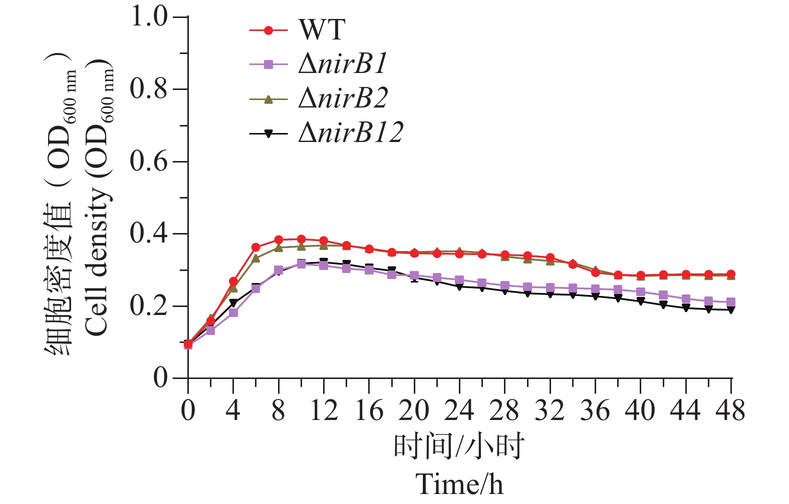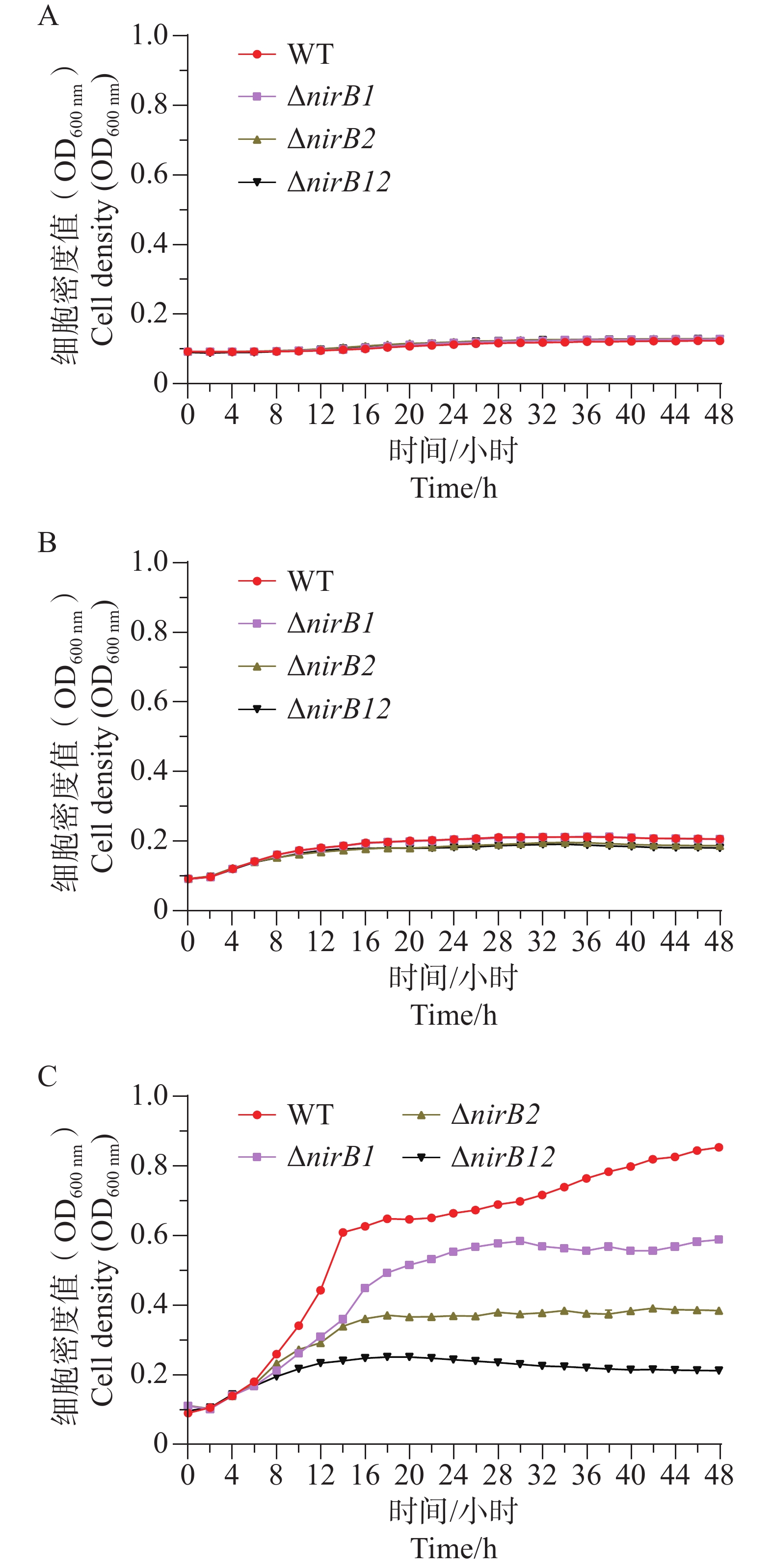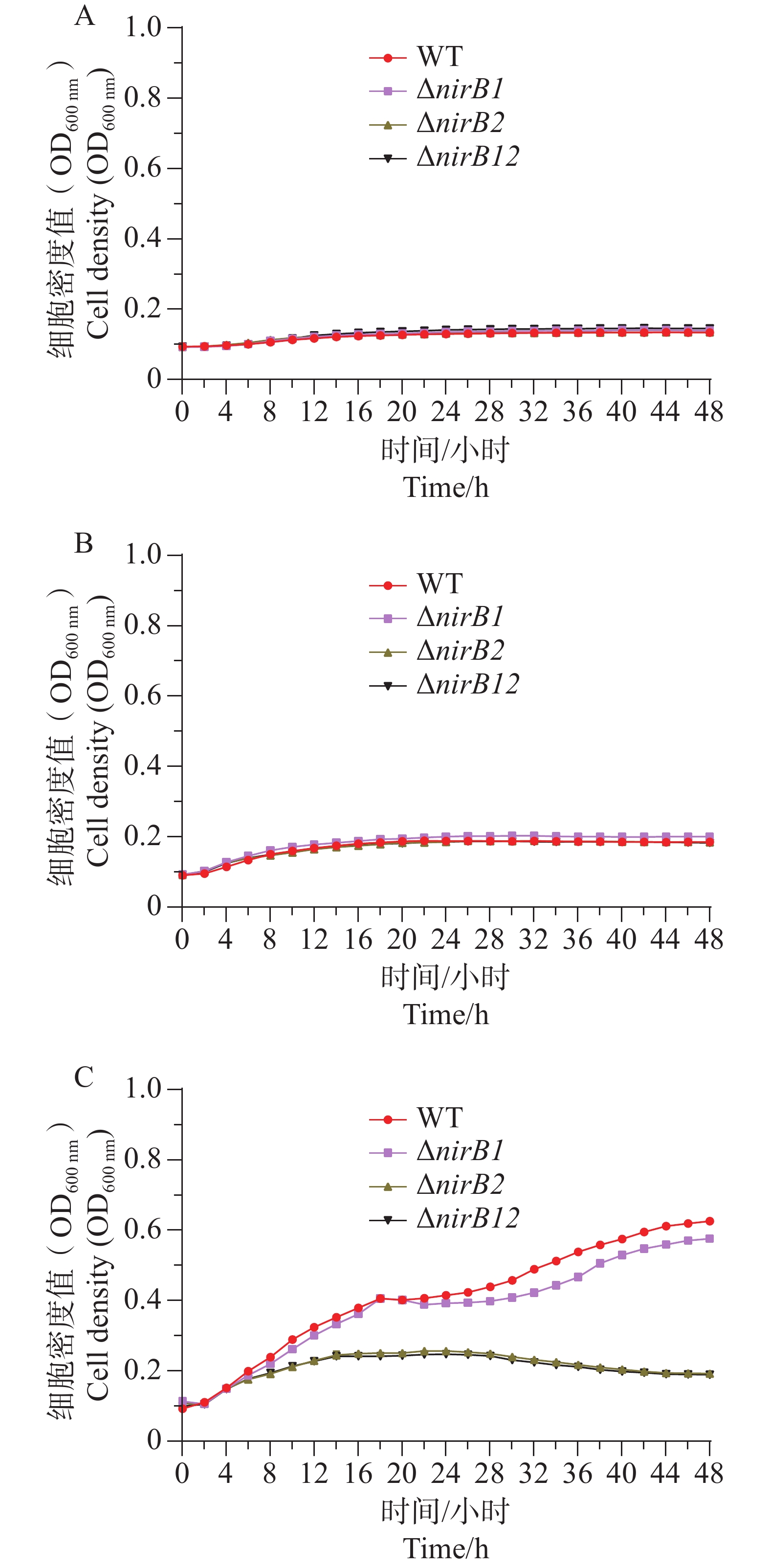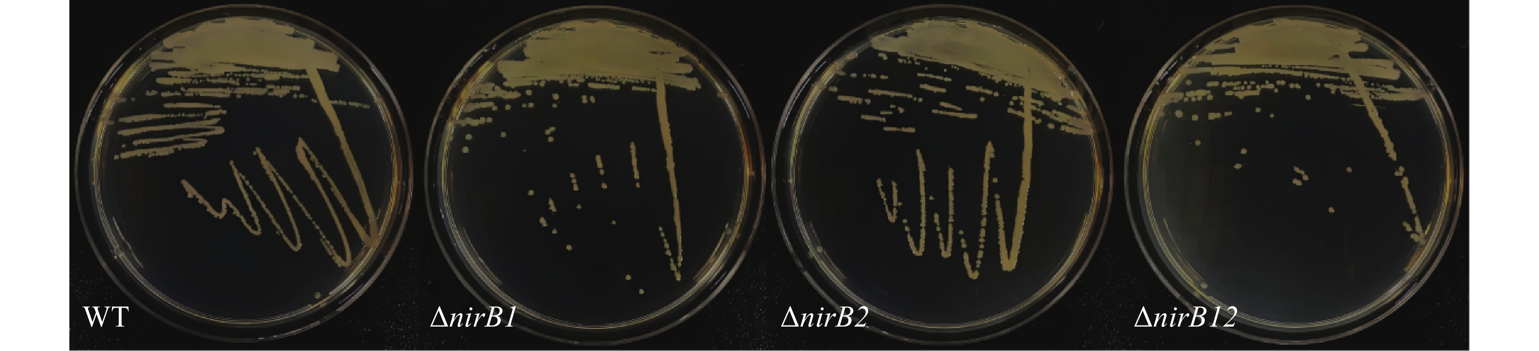 Vibrio alginolyticus, a conditionally pathogenic bacterium widely present in marine environments, can utilize various inorganic nitrogen sources such as ammonium, nitrate, and nitrite for growth, causing significant economic losses in the marine aquaculture industry. The nirB gene encodes nitrite reductase, which plays an important role in bacterial nitrogen metabolism and environmental adaptation. An attempt was made to analyze the function of the nirB gene in V. alginolyticus during the utilization of inorganic nitrogen sources. Two nirB gene-related knockout strains of V. alginolyticus were constructed: a nirB1 deletion strain (ΔnirB1) and a nirB2 deletion strain (ΔnirB2), and a double deletion strain lacking both nirB1 and nirB2 (ΔnirB12) was also constructed. These strains were cultured in different types of inorganic nitrogen media to observe their growth. The results showed that the nirB gene promotes the utilization of ammonium and nitrate in V. alginolyticus, with the nirB1 gene playing a key role in the conversion of nitrate to nitrite. In nitrite media, deletion of the nirB gene significantly inhibited the growth of V. alginolyticus, indicating that the gene also plays an important role in nitrite utilization, and the nirB2 gene has a more critical function in this process. Moreover, the presence of ammonium was also found to affect the utilization of nitrite by V. alginolyticus, suggesting a possible competitive relationship. All the results provide a foundation for further understanding of the function of the nirB gene in V. alginolyticus and its role in nitrogen metabolism.