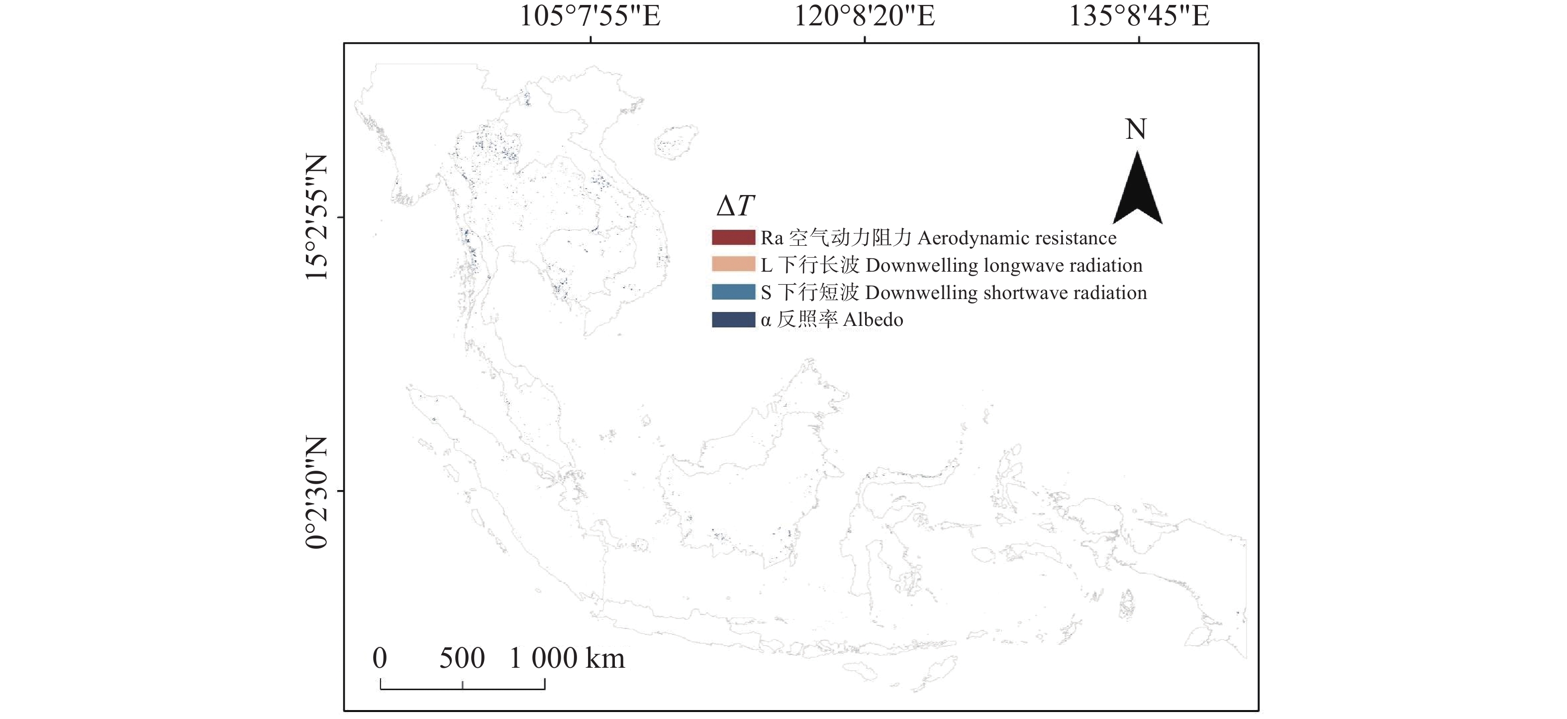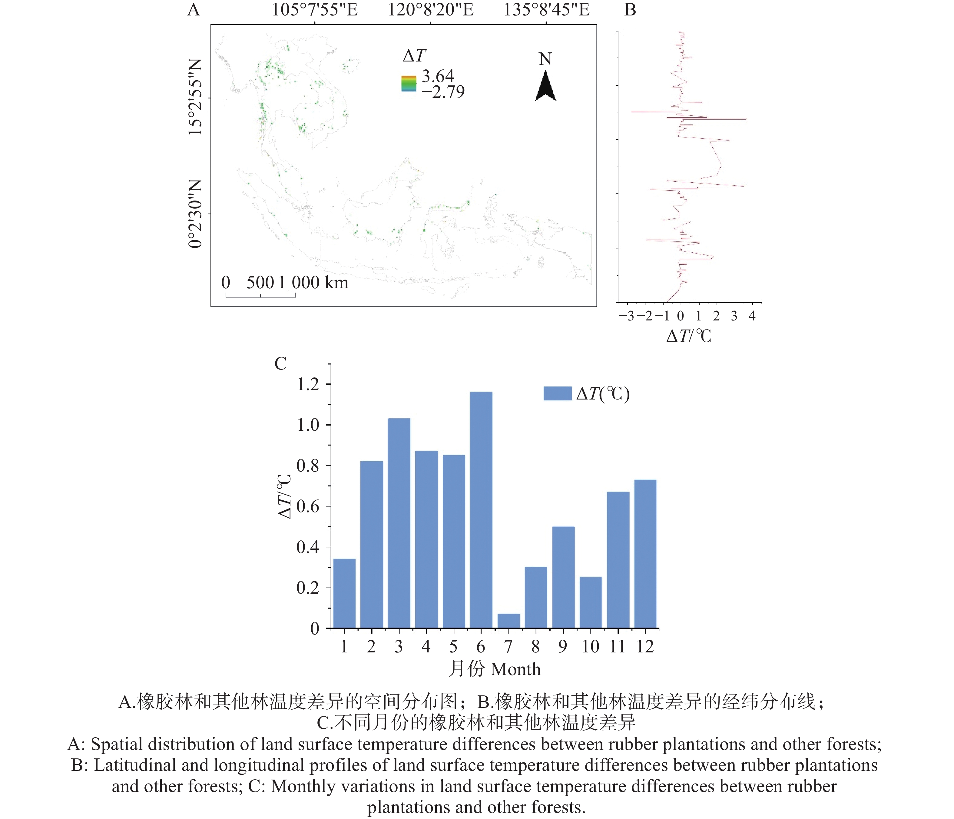 The rapid expansion of rubber plantations has triggered multiple ecological and environmental effects, leading to surface warming through alterations in land surface energy balance and vegetation–atmosphere interactions. Based on multi-source satellite observations, a temperature response model, and the two-resistance mechanism (TRM) framework, the differences in land surface temperature (LST) between natural forests and rubber plantations in the Southeast Asia countries were systematically attributed. The results show that, compared with adjacent natural forests, rubber plantations exhibit an annual mean LST increase of approximately 0.63°C, presenting a consistently “warmer” signal throughout the year. The warming peaks in June and reaches its minimum in July. Mechanistic diagnosis indicates that the increase in aerodynamic resistance (ra) is the dominant driver of surface warming, accounting for more than 60% of the total contribution, which is substantially higher than that of radiative factors such as albedo (α), downward shortwave radiation (S), and downward longwave radiation (L↓). By suppressing latent heat flux and enhancing sensible heat transfer, increased ra elevates surface temperature. In contrast, L↓ exhibits a cooling effect in the attribution framework and jointly regulates surface temperature together with downward shortwave radiation and albedo. Furthermore, under dry and normal moisture conditions, temperature regulation is primarily controlled by ra, whereas under wet conditions, the influence of L↓ becomes more pronounced. These findings reveal the coupled feedback mechanisms among land-use practices, vegetation structure, and regional climate across multiple spatial scales and seasons. The redistribution of radiative and non-radiative fluxes alters surface energy balance and temperature differentials, providing methodological support and a scientific basis for developing region-specific, scenario-sensitive sustainable agricultural policies and land-based climate change mitigation strategies.