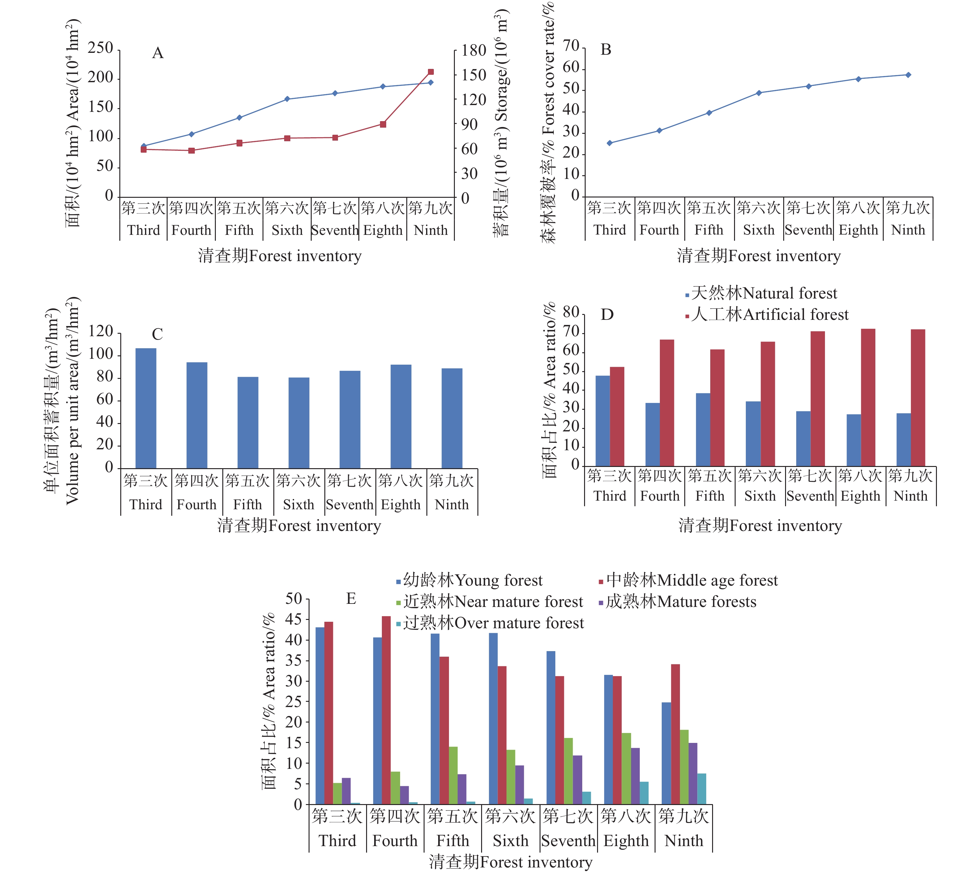 Based on forest resource data of Hainan Province from the third to the ninth national forest resource inventories and relevant ecological station data from the same period, the dynamic characteristics of forest resources over more than 30 years (1984–2018) were systematically analyzed in terms of "quantity-quality-structure", and the evolutionary patterns of key ecosystem service functions were quantified in accordance with national standards, aiming to reveal their intrinsic coupling relationships. The results showed that forest resources in Hainan Province had achieved remarkable growth, with forest area, stock volume, and forest coverage increasing by 124.48%, 163.84%, and 31.96 percentage points, respectively. The forest age structure had been continuously optimized, and forest quality had steadily improved, with policy and institutional factors identified as key drivers of these changes. All assessed ecosystem service functions had significantly enhanced, particularly water regulation and negative ion provision, which had increased by over 240%. Correlation analysis further revealed that the area of mature and overmature forests had the greatest dominant effect on water conservation and soil fixation services, while stock volume per unit area was the key determining factor for carbon sequestration service. This highlighted the central role of forest quality and maturity in enhancing ecosystem services, underscoring the central importance of indicators of forest quantity (area, stock volume) and indicators of maturity. All these findings elucidate the coupling relationship between the growth of forest resources and the dynamic changes in ecosystem service functions, providing a scientific basis for the sustainable management of regional forests.