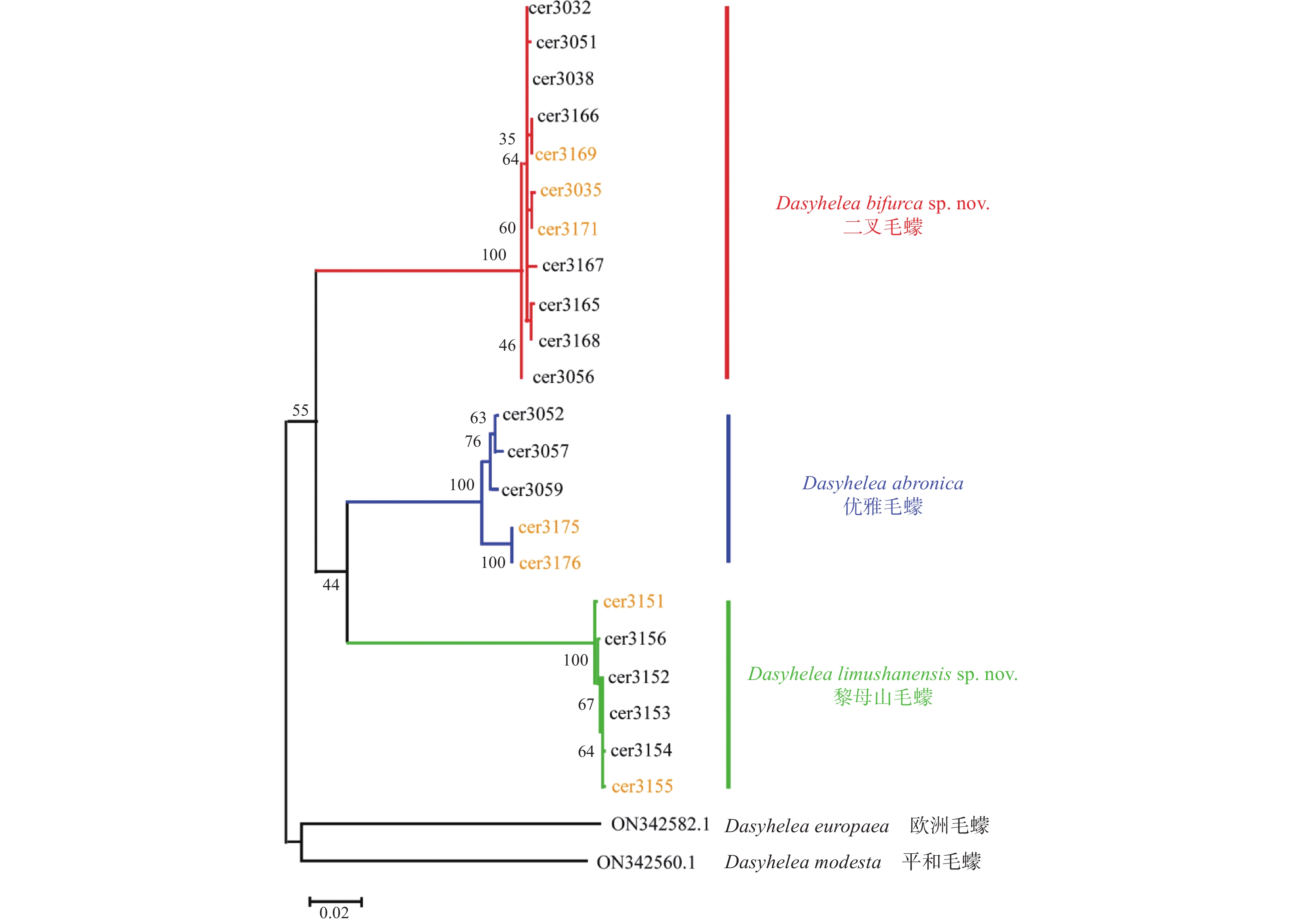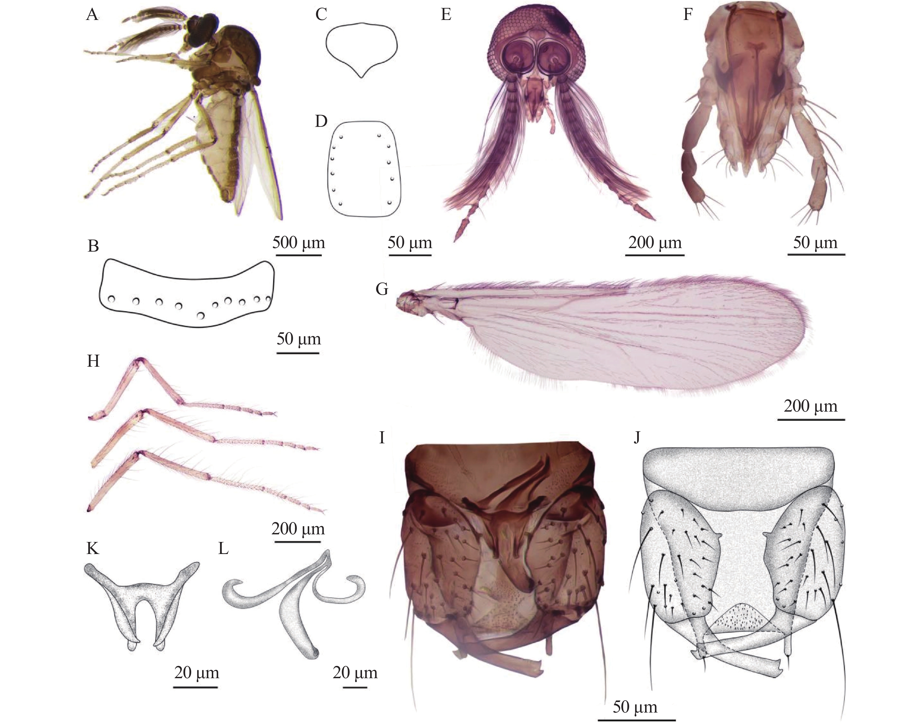 The subgenus Dasyhelea are the most diverse group of the genus Dasyhelea (Diptera: Ceratopogonidae: Dasyhelea) including over 400 species worldwide, with 56 species from China and only four from Hainan Island. Based on the systematic collections in the tropical rainforests of Hainan Island and their morphological and DNA barcoding (COⅠ) analyses, two new species of Dasyhelea, Dasyhelea limushanensis sp. nov. and D. bifurca sp. nov., were described, and a newly recorded from Hainan Island, D. abronica Yu, 2001, were also reported. The morphological characteristics of the new species were described in detail, and their identification diagrams and the cytochrome c oxidase subunit I (COI) barcoding data were presented.