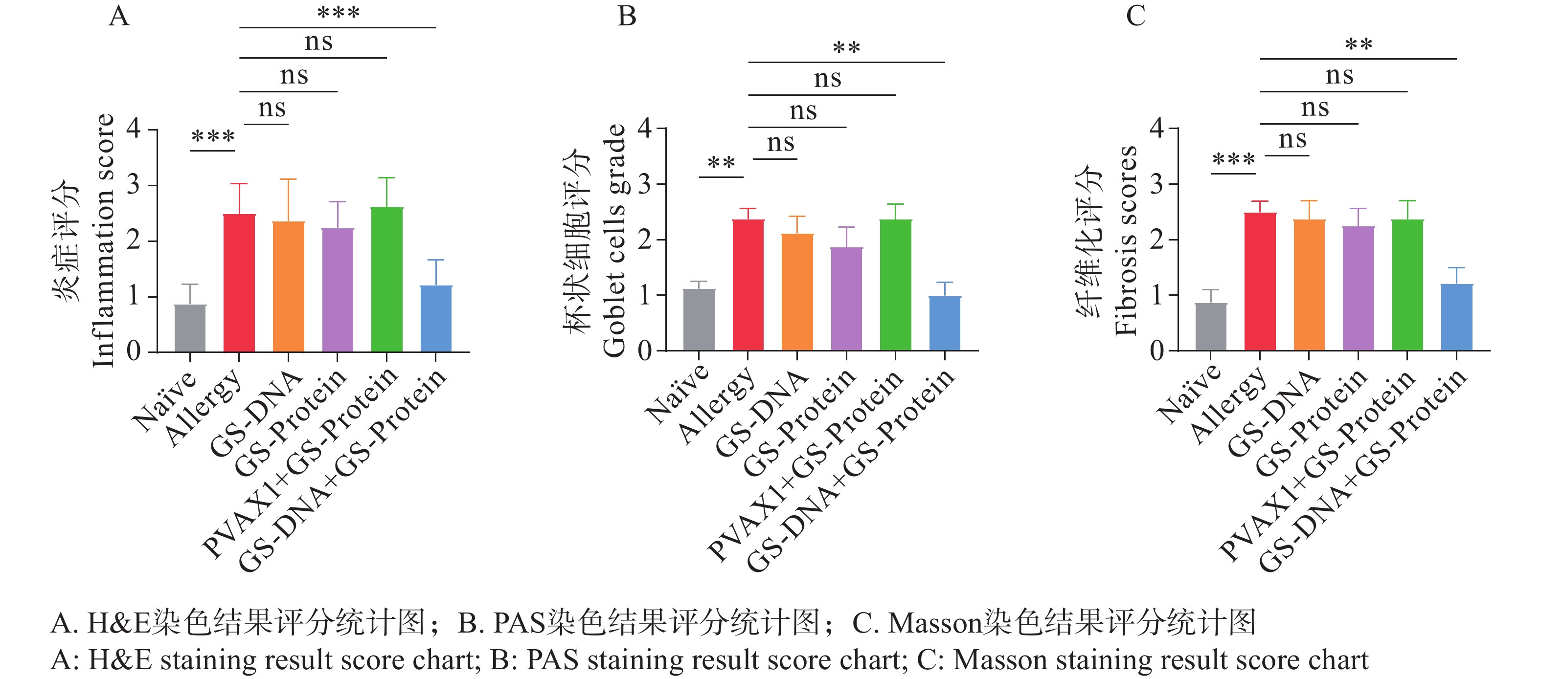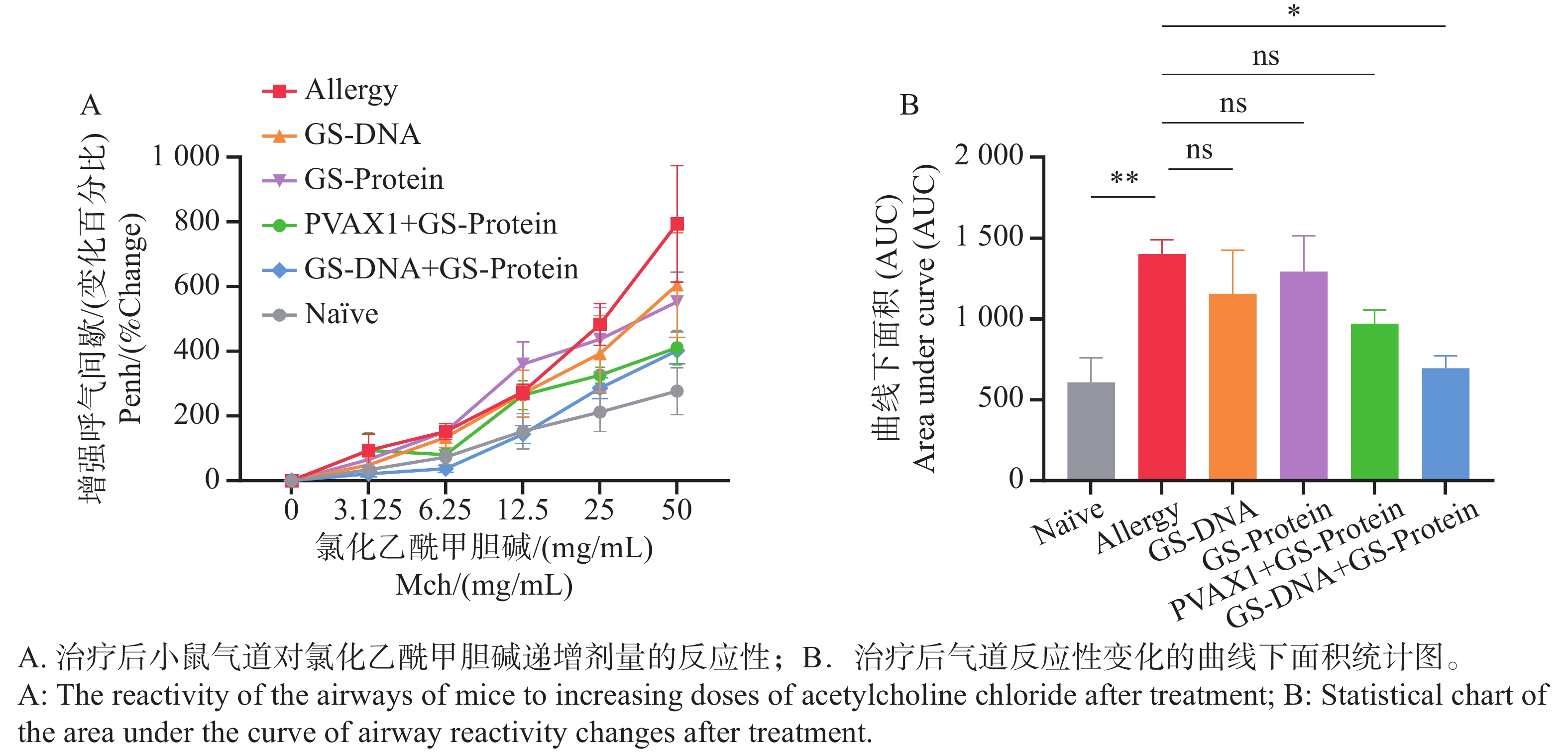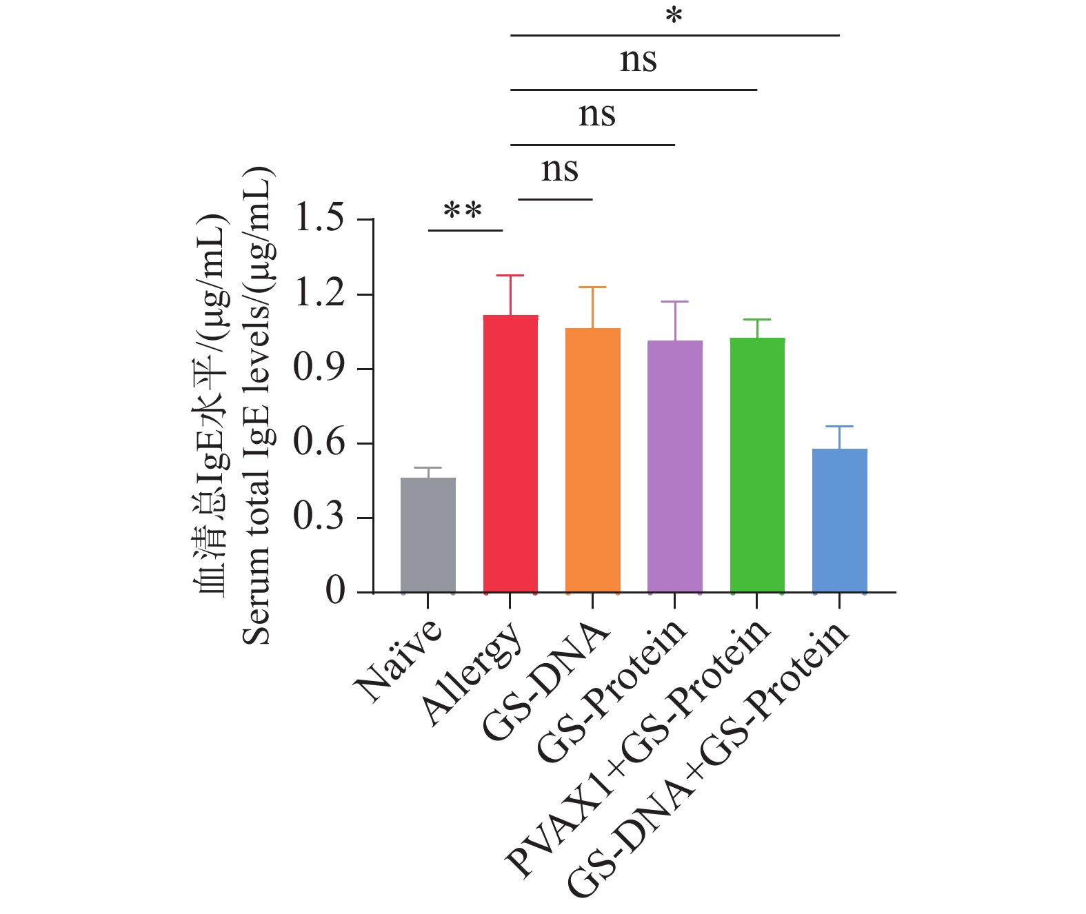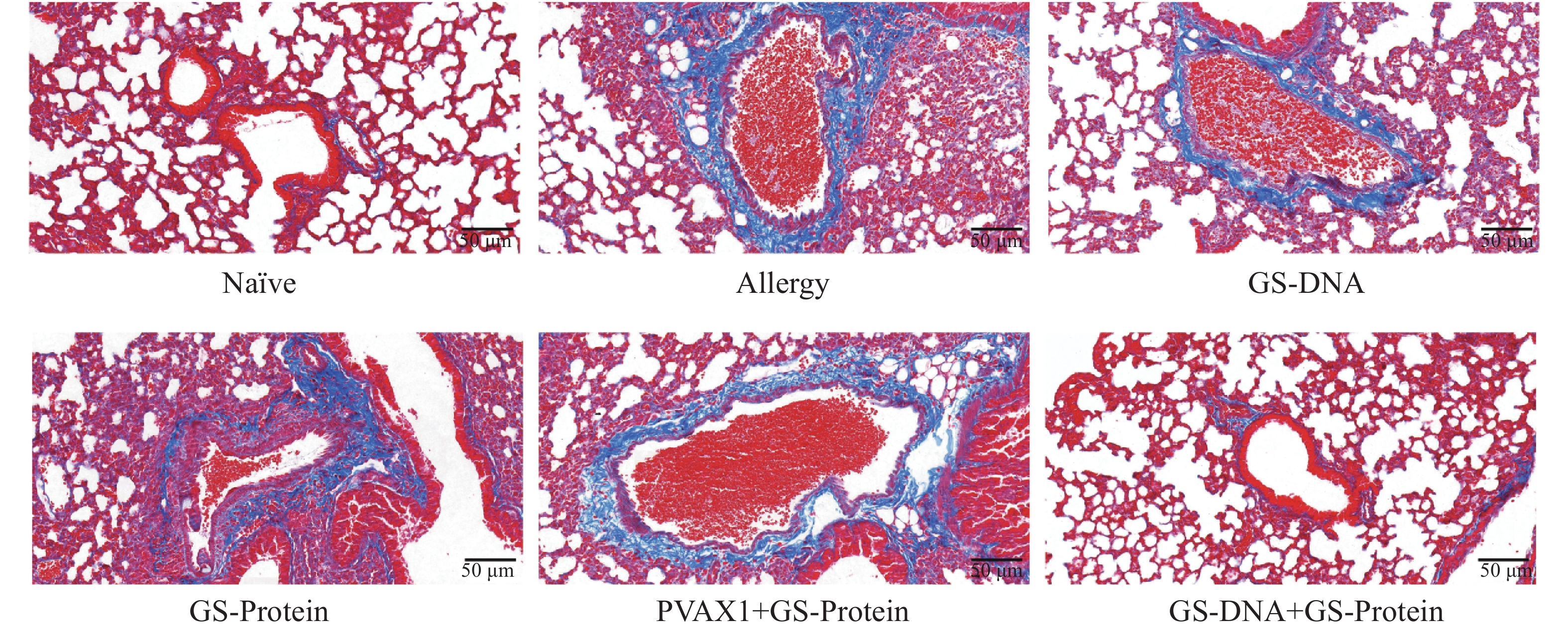 An attempt was made to investigate the therapeutic efficacy of layered double hydroxides (LDH) nanofusion protein vaccines in cat and dog fusion allergens-induced mouse model, which provides a potential novel vaccine strategy for the treatment of canine and feline allergic diseases. A cat and dog fusion allergen was prepared and loaded onto layered double hydroxide nanomate vials to construct a vaccine. BALB/c mice were selected and sensitized to the cat and dog fusion allergen by intraperitoneal injection and lung perfusion to establish a mouse allergy model. Subsequently, the allergy model mice were randomly divided into four groups: normal (naïve) group, allergy model group (allergic model), LDH group and vaccine group, with six mice in each group. Among them, the normal group was not treated, and the mice in the allergic model group, LDH group and vaccine group were given phosphate buffered saline (PBS), LDH nanosuspension, and LDH nanofusion protein vaccine injections, respectively, and the results of serum IgE, pulmonary respiratory resistance, temperature change, ear prick, and pathological section were detected to comprehensively evaluate the vaccine treatment effect. The results showed that compared with the Allergic model group, the vaccine group treated with LDH nanofusion protein vaccine significantly decreased the serum-specific IgE levels of mice, alleviated lung respiratory resistance, highly significantly reduced allergen-induced body temperature and the area of ear dye leakage, significantly reduced inflammatory infiltration in the lungs, reduced the number of cuprocytes although not significantly, and reduced the degree of collagen deposition and fibrosis. Taken together, these results indicate that the laminar double hydroxide nanocat-dog fusion protein vaccine has a good therapeutic effect on the cat-dog fusion allergen-induced mouse allergy model, and is able to effectively improve the allergy symptoms and reduce the inflammatory reaction of allergy-associated tissues in mice.