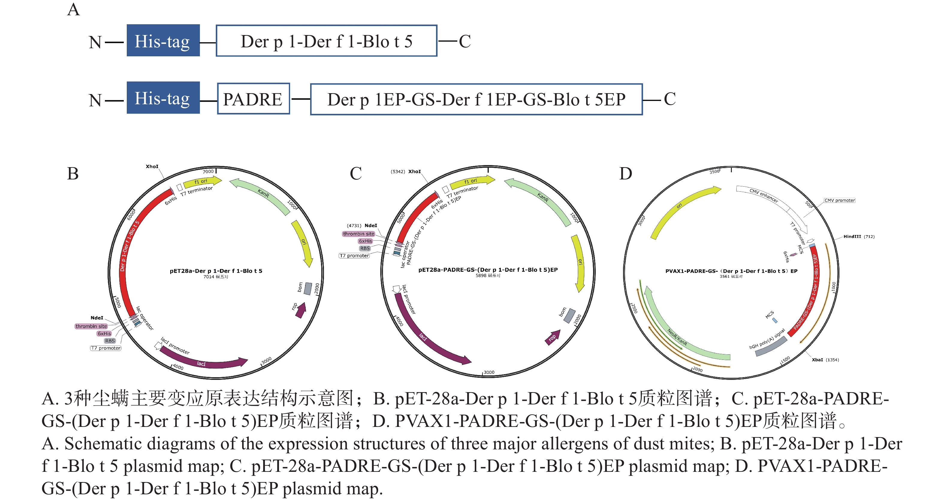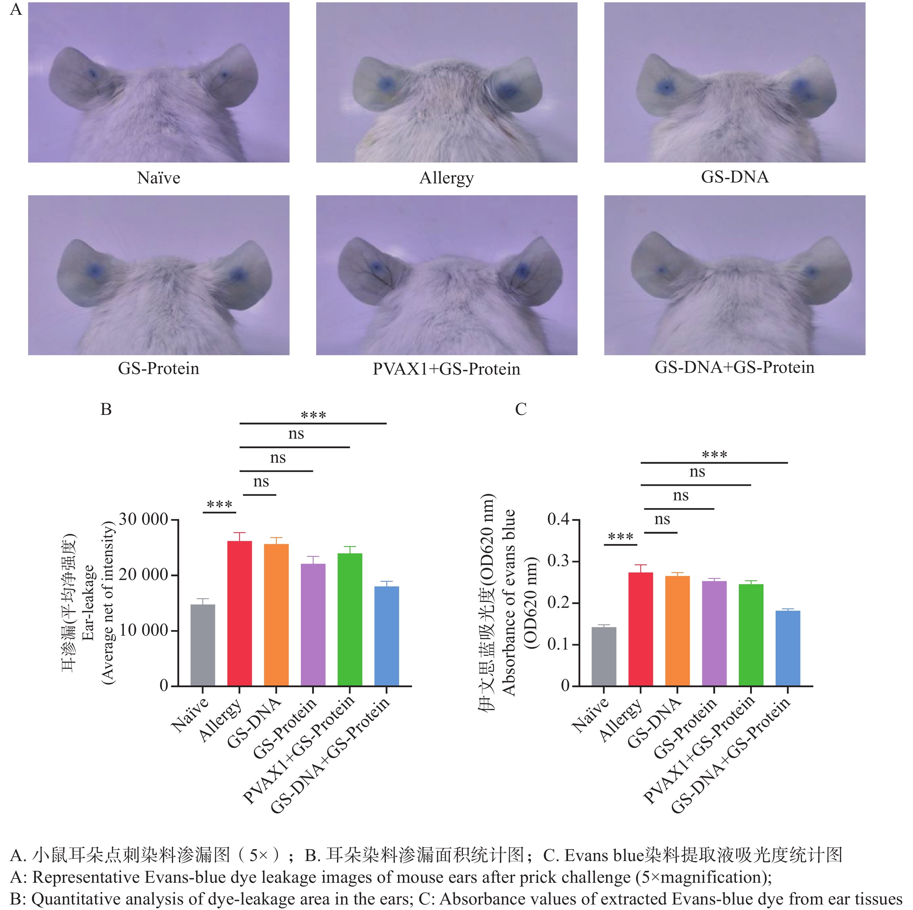 An attempt was made to analyze the therapeutic effect of combined DNA and protein vaccines on a mouse model of dust mite allergy induced by a fusion allergen. In this attempt eukaryotic and prokaryotic expression plasmids of the major dust mite allergen fusion epitope were constructed to prepare a combined DNA and protein vaccine. A mouse model of dust mite allergy was induced by the fusion allergen Der p 1-Der f 1-Blo t 5. The mice were randomly divided into an allergy group (Allergy) and a vaccine group, with 6 mice in each group. A normal group (Naïve) was set as a control. The vaccine group was injected with the corresponding vaccine, the allergy group was injected with an equal volume of PBS (phosphate buffered saline), and the normal group received no treatment. The therapeutic effect of the vaccine was comprehensively evaluated by detecting the total IgE (immunoglobulin E) level in the mouse serum, changes in airway hyperresponsiveness, the area of dye leakage in the ear, and pathological features of lung sections. The results showed that compared with the allergy group, the combined DNA and protein vaccine group had significantly lower total IgE levels of serum, significantly reduced airway hyper-responsiveness, had significantly smaller area of dye leakage in the mouse ear, alleviated lung tissue inflammatory cell infiltration, reduced average goblet cell numbers in the bronchus, and decreased collagen fiber deposition. It is concluded that the combined DNA and protein vaccine has a good immunotherapeutic effect on the dust mite allergy mouse model, which can provide an important reference for the development of preventive and therapeutic vaccines for dust mite allergy.