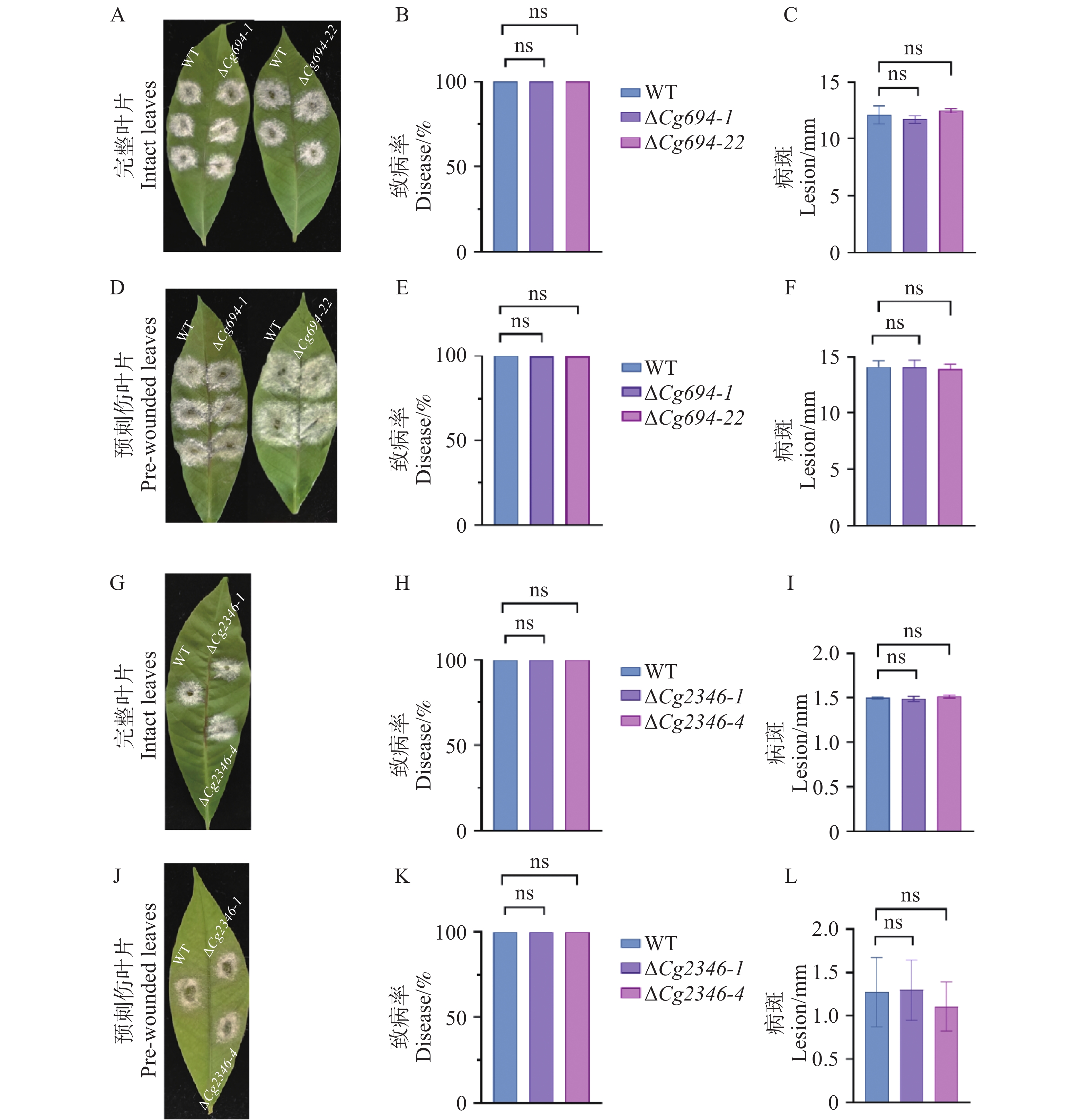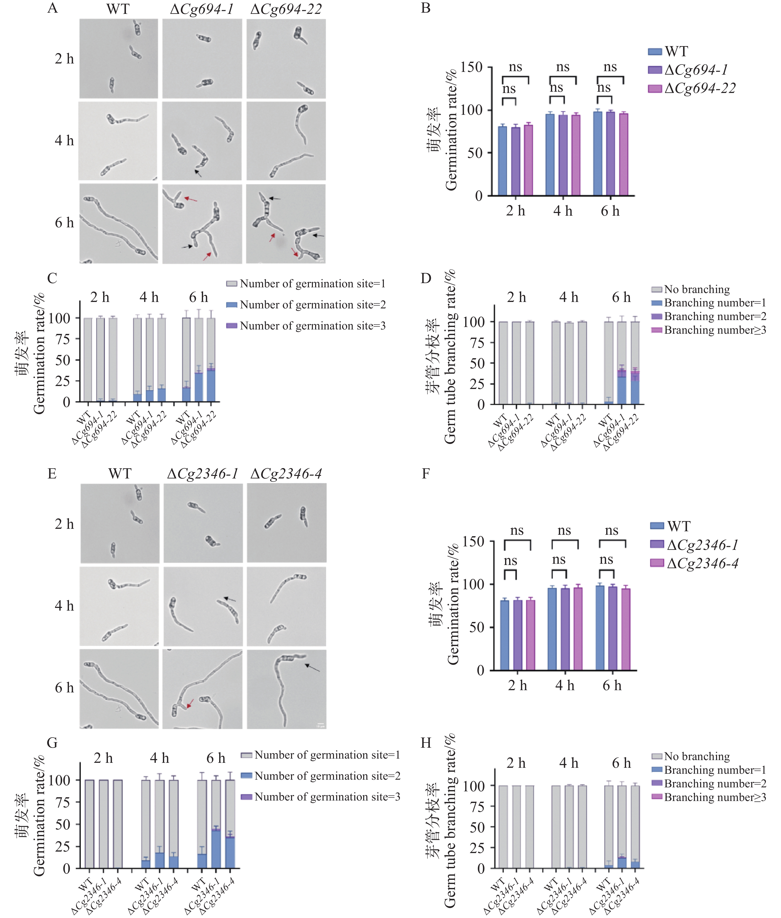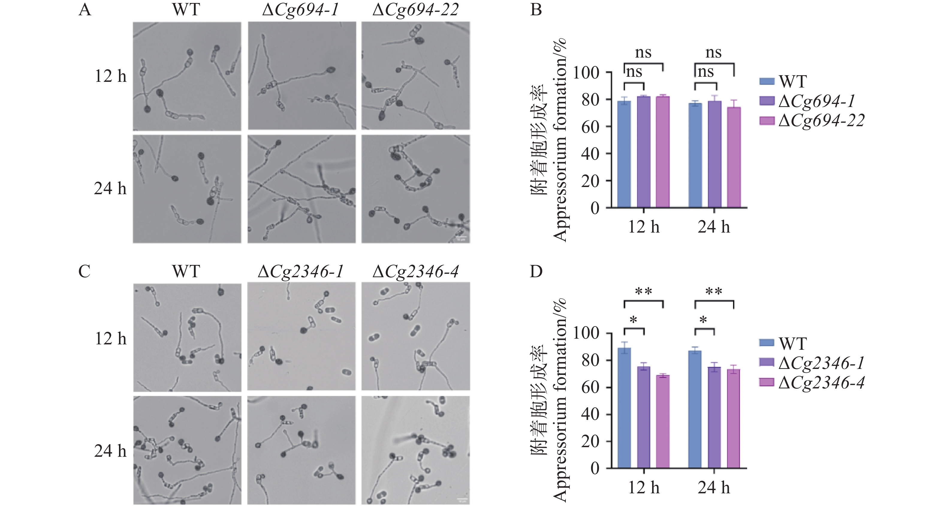 Natural rubber is a critical strategic resource in China, and anthracnose of rubber trees caused by Colletotrichum gloeosporioides directly threatens the healthy development of the rubber industry. During infection, C. gloeosporioides secretes numerous protein effectors, and their roles in overcoming plant immunity remain poorly understood. Investigating potential effector proteins in C. gloeosporioides can provide a theoretical basis for controlling anthracnose. In this context, two candidate effector proteins, Cg694 and Cg2346, were predicted in C. gloeosporioides. Quantitative real-time PCR revealed that the transcriptional expression of the genes Cg694 and Cg2346 was significantly upregulated during the development stages of spore, germination, and appressorium compared with the vegetative hyphal stage. Subcellular localization assays via transient expression (Green fluorescent protein) in Nicotiana benthamiana epidermal cells showed that both Cg694 and Cg2346 genes were localized to the nucleus and cell membrane, and their transient overexpression induced necrosis in tobacco leaves. Furthermore, gene knockout mutants ΔCg694 and ΔCg2346 were generated. Phenotypic analysis indicated that ΔCg694 and ΔCg2346 exhibit enhanced germ tube polar growth and reduced early invasive hyphal formation rates in onion epidermal cells. Notably, the ΔCg2346 mutant also show a decreased ability to form appressoria. However, neither ΔCg694 nor ΔCg2346 mutants display significant changes in pathogenicity on rubber tree leaves. These results demonstrate that Cg694 and Cg2346 are involved in modulating the polar growth and early invasion capabilities of C. gloeosporioides, though their precise functions require further investigation.