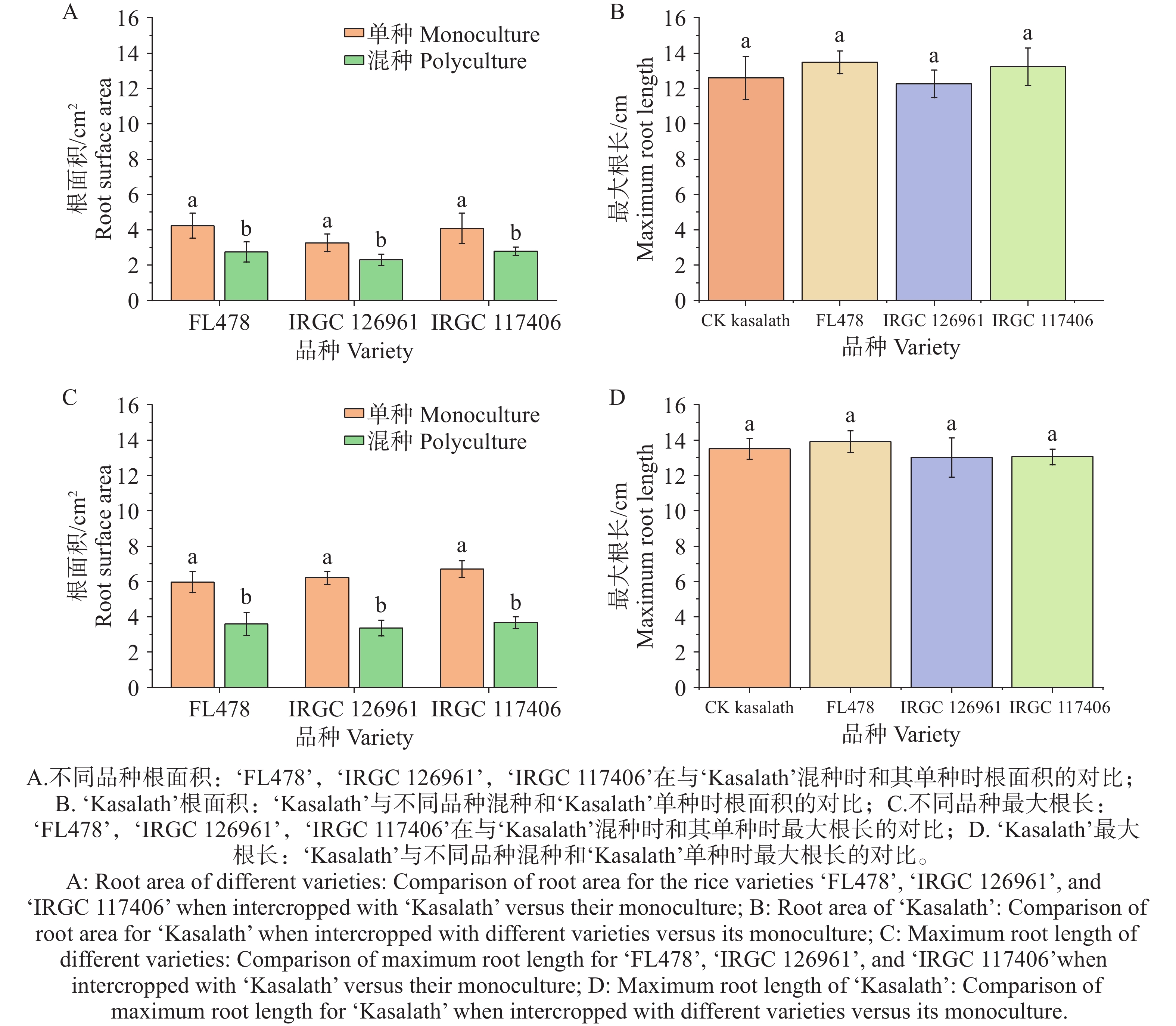 The belowground interactions of rice varieties during the seedling stage play a critical role in population structure establishment and resource acquisition, whereas their underlying chemical ecological mechanisms remain poorly understood. Under controlled conditions, paired mixed-cultivation experiments were conducted to compare the root interaction effects between ‘Kasalath’ and three companion rice varieties (‘FL47’, ‘IRGC