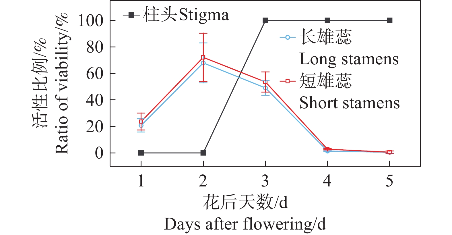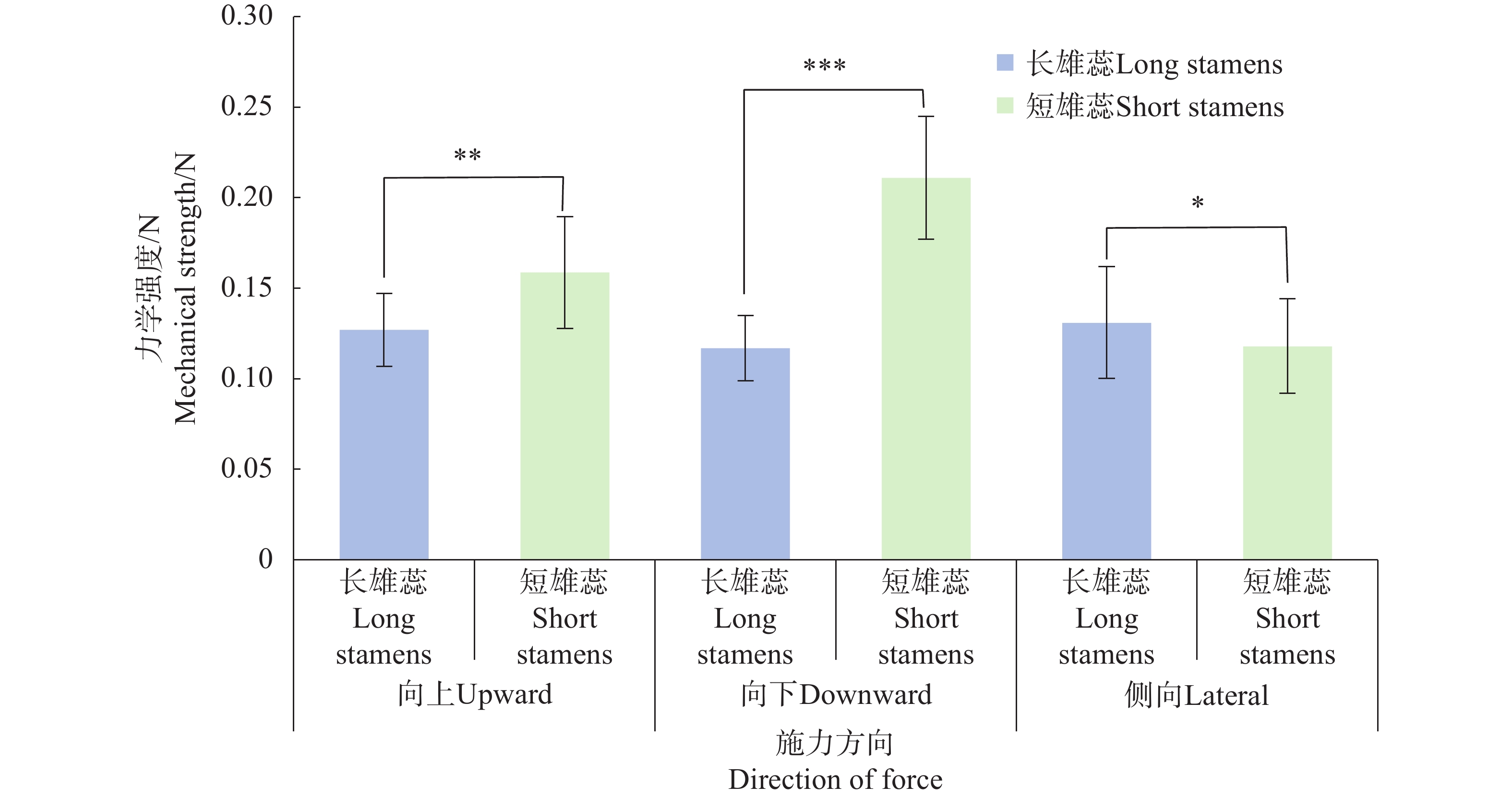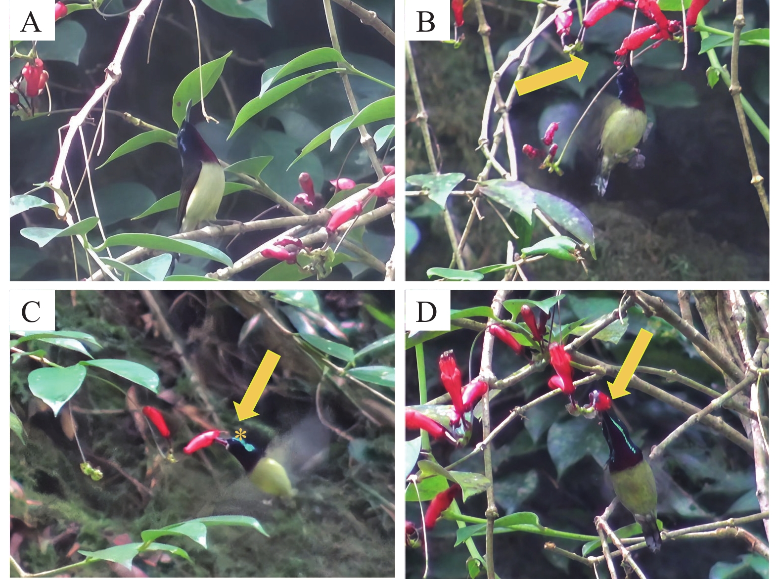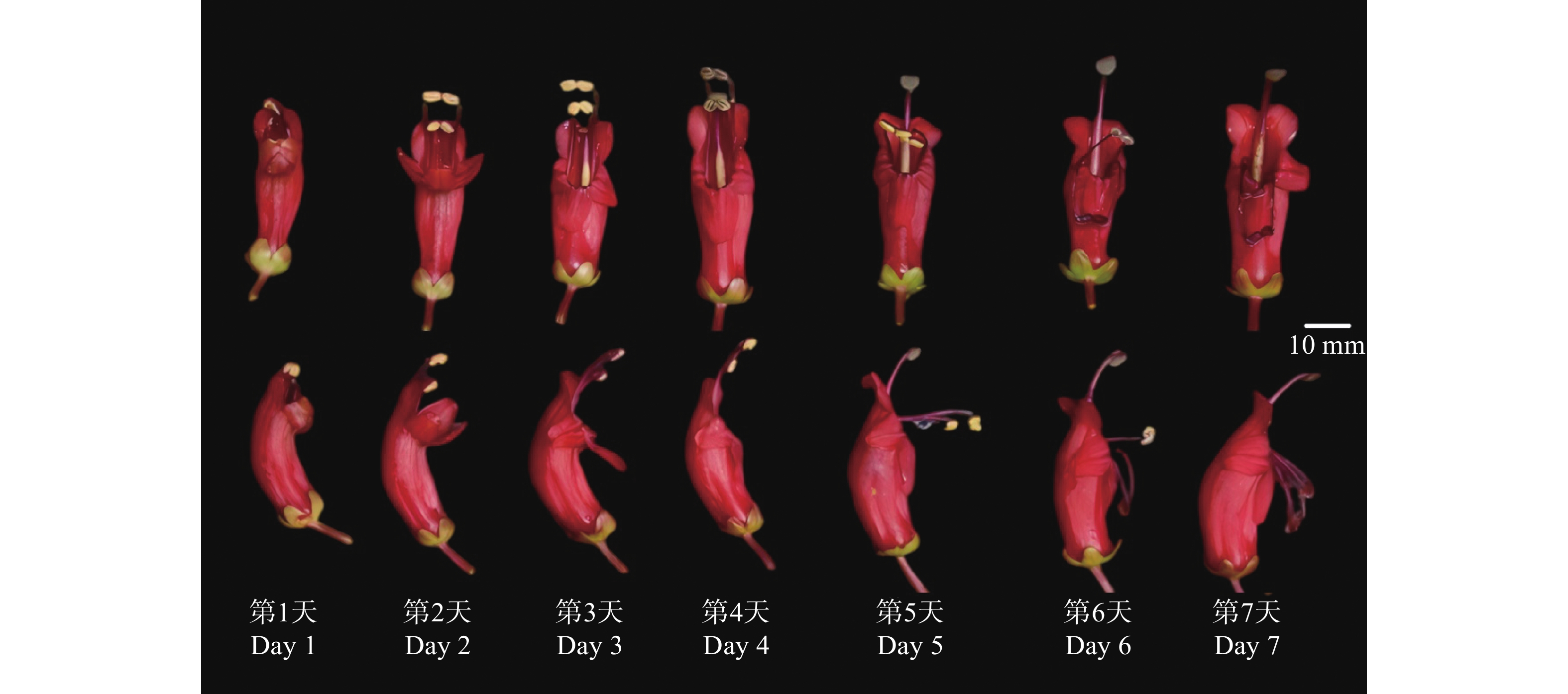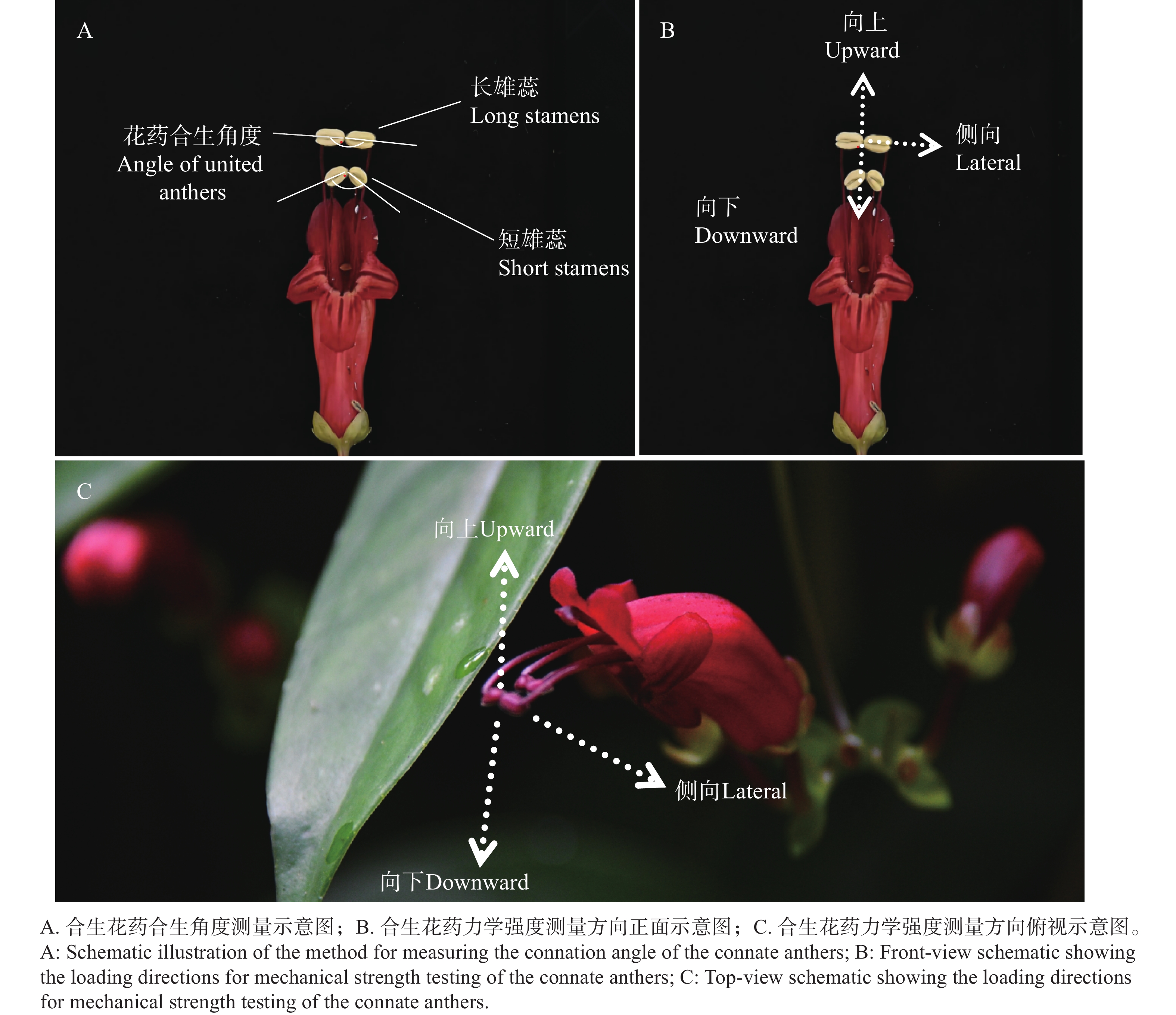 Anther connation is an important floral trait that influences pollination accuracy and efficiency by altering anther arrangement and anther-stigma separation (herkogamy). The flowering biology, the mechanical properties of connate anthers, and the pollination process of Aeschynanthus moningeriae (Gesneriaceae)at Mt. Wuzhi in Hainan Island, China were examined to investigate the developmental pattern of anther connation and pollination adaptation in the bird-pollinated A. moningeriae. The results showed that A. moningeriae is hermaphroditic, with didynamous stamens containing anthers in pairs from the bud stage and that anthers were coherent throughout the whole flowering period. The long anther pair ultimately formed an angle of approximately 180° (parallel) while the short anther pair grow at 115° (inverted V-shape). The short anther pair was connated with more fused part than the long anther pair. The mechanical strength of the short anther pair was F=0.159 ± 0.031 N and F=0.211 ± 0.034 N in the upward and downward directions respectively, which is significantly higher than that of the long anther pair (upward: F=0.127 ± 0.020 N; downward: F=0.117 ± 0.018 N). The fork-tailed sunbird (Aethopyga latouchii) was the only effective pollinator. The red corolla, along with the black stripes on the lobes, function as a nectar guide. The long anther pair was mainly touched by the bird forehead, while the short anther pair was contacted mainly by the narrow base of the bird beak. Such separated pollen deposition increased the contact probobality of the stigma with pollen. Because the bird beak exerted stronger force on anthers, the higher mechanical strength with higher fusion proportion of the short anther pair can thus maintain at a fusion mode and spatial position of the connate anthers under stronger force, increasing pollen removal ratio.