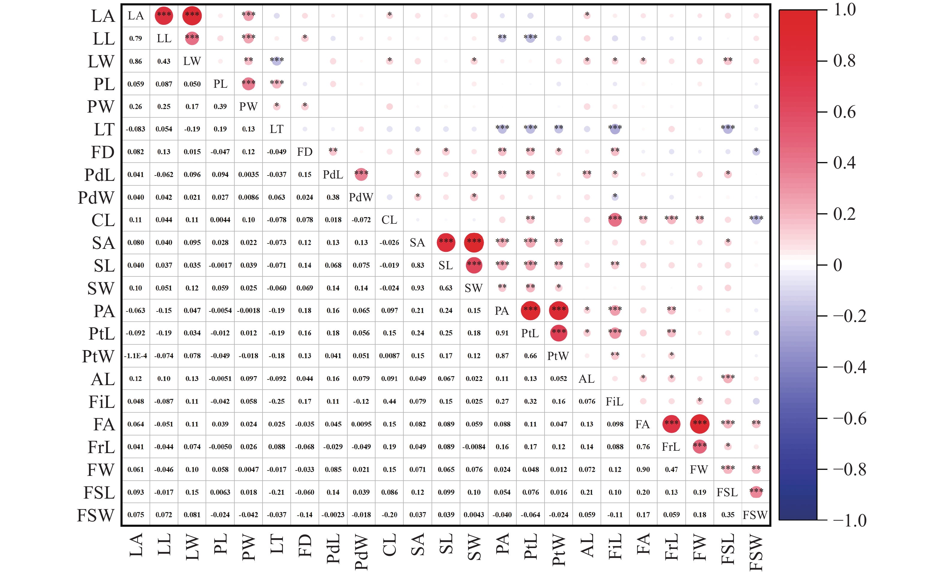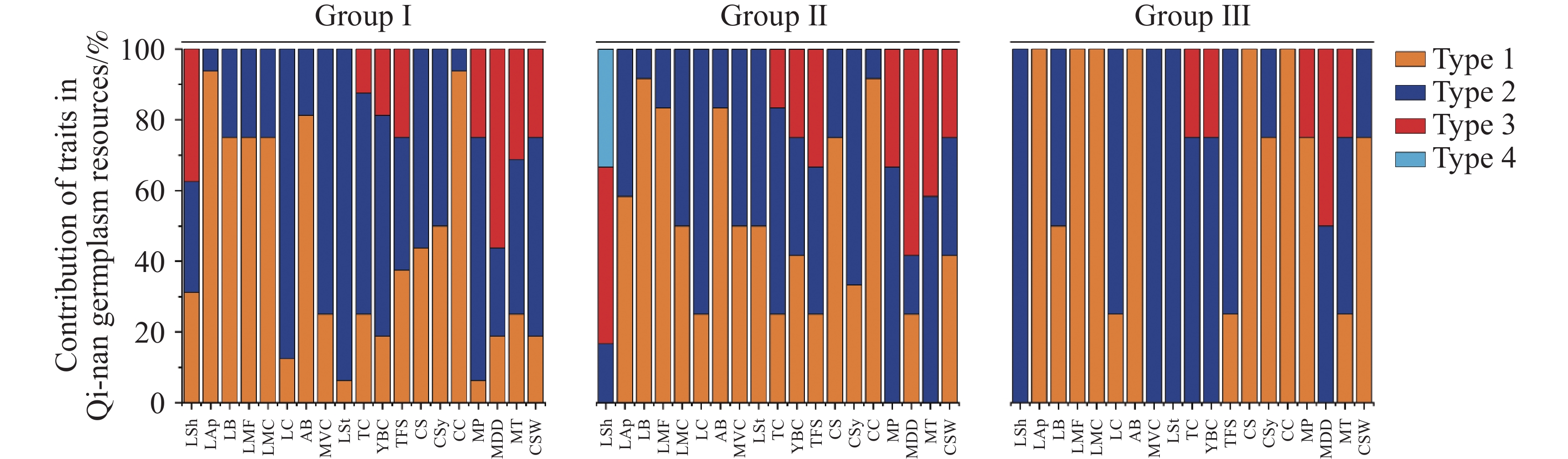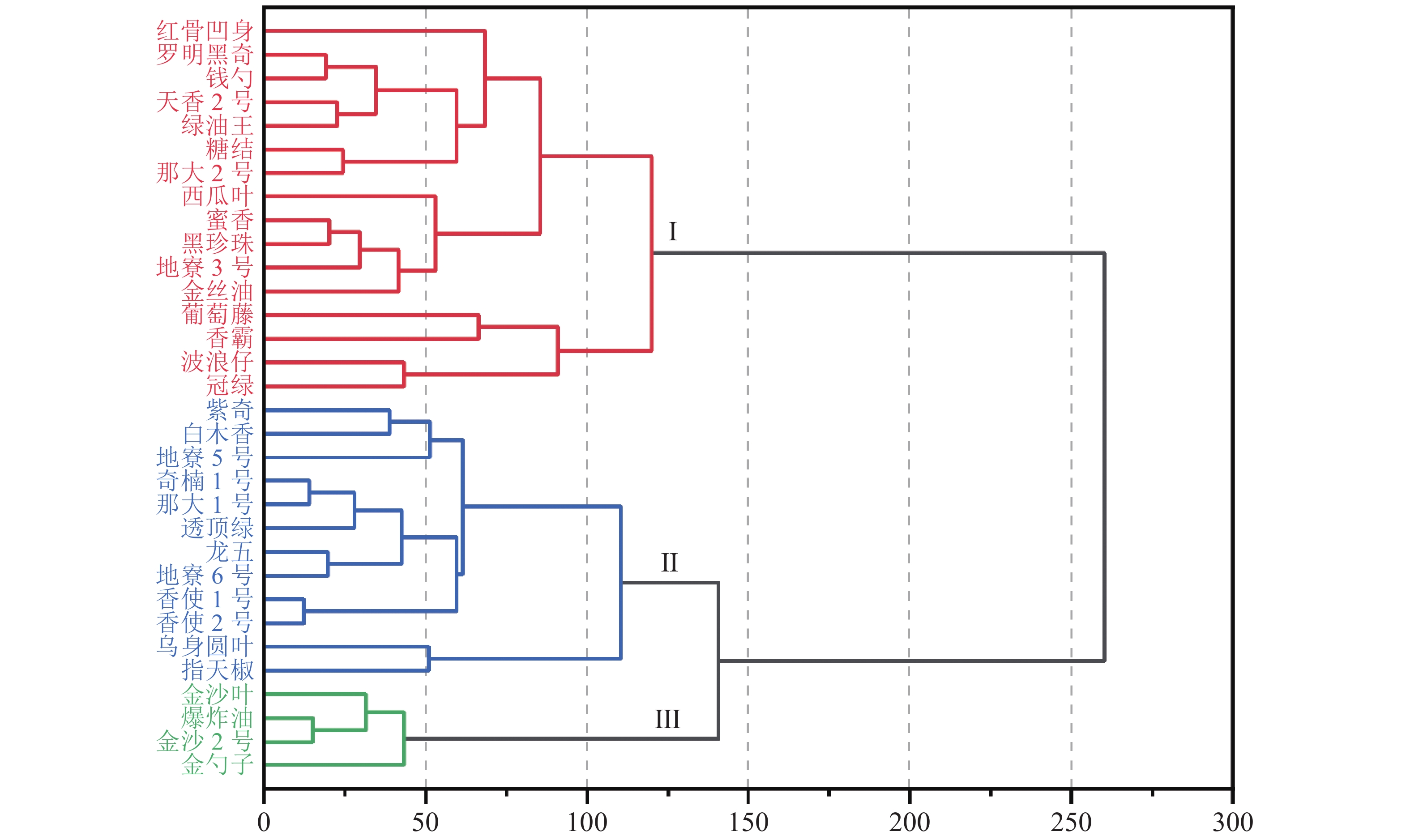 The phenotypic traits of 32 accessions of Qinan agarwood germplasm of Aquilaria sinensis conserved in Danzhou City, Hainan Province were selected for evaluation and analysis to reveal their genetic diversity and variation patterns, thereby providing a theoretical basis and technical support for the identification, evaluation, development, and utilization of superior A. sinensis germplasm. A total of 23 quantitative traits and 19 qualitative traits from leaves, flowers, and fruits of the 32 accessions of Qinan agarwood germplasm were selected for observation, and evaluated by using genetic diversity indices, correlation analysis, principal component analysis, and cluster analysis. The results showed a rich phenotypic genetic diversity among the germplasm accessions. The coefficients of variation for quantitative traits ranged from 9.04% to 34.77%, with Shannon’s diversity index ranging from 1.73 to 2.09. Higher diversity indices were observed for leaf length/width ratio, calyx tube length, sepal length/width ratio, and fruit width. For qualitative traits, H′ ranged from 0.234 to 1.285, with leaf shape exhibiting the highest diversity. Correlation analysis indicated that most of the leaf, petiole, and floral traits showed highly significant positive correlations, while leaf thickness was significantly negatively correlated with floral traits and fruit stalk length. Comprehensive analysis suggested that leaf shape and young branch color could serve as ideal phenotypic indicators for identification. Eight principal components were extracted from PCA, cumulatively explaining 72.68% of the total variance. The first four principal components primarily reflected variation in petals, sepals, fruits, and leaves, contributing substantially to the phenotypic variation. Cluster analysis divided the 32 germplasm accessions into three groups: Group I (16 accessions) was characterized by rich trait variation, gray-brown young branches, relatively large and slightly curled leaves; Group II (12 accessions) showed significant individual differences in leaf and floral traits, with asymmetric capsules and fewer pericarp wrinkles; Group III (4 accessions) displayed high trait consistency, featuring relatively small, broad-elliptical leaves, capsules with a pointed apex, and an inconspicuous midline. The 32 accessions of A. sinensis germplasm possess high phenotypic diversity. Traits such as leaf shape, young branch color, and fruit shape showed good distinguishing potential and can be used for phenotypic identification. All the findings provide a basis for the classification, core germplasm screening, and breeding of A. sinensis.