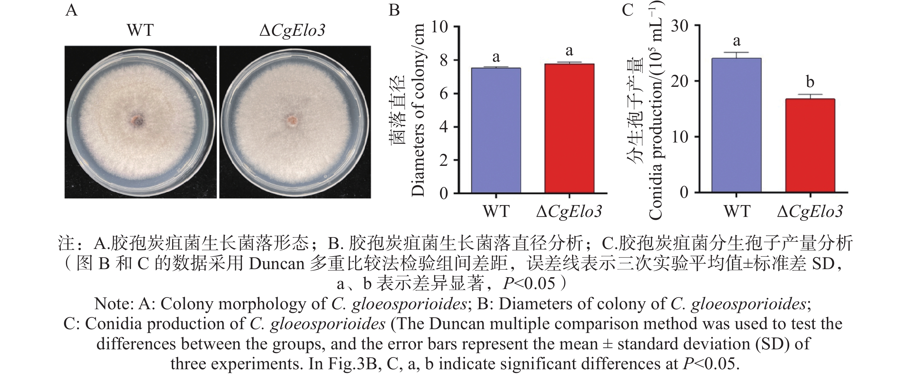 Hevea brasiliensis is the main source of natural rubber and serves as an important economic crop supporting the tropical agricultural economy in our country. Anthracnose caused by Colletotrichum gloeosporioides is an important reason for reduced natural rubber yield. Very long-chain fatty acids (VLCFAs) play an important role in maintaining cell membrane stability and in the development of pathogen appressorium structures. The very-long-chain fatty acid elongase (Elo) is a rate-limiting enzyme involved in regulating VLCFA synthesis. However, the function of Elo in C. gloeosporioides remains unclear. This study focuses on the very-long-chain fatty acid elongase CgElo3 of C. gloeosporioides. Analysis of physiological phenotype in ΔCgElo3 shows that deletion of CgElo3 does not affect hyphal growth or the formation of appressorium, but it significantly reduces the conidiation of C. gloeosporioides, its pathogenicity on rubber tree leaves, and the formation rate of invasive hyphae during the early infection of onion epidermis. Lipidomic data confirmed that the relative contents of stearic acid, linoleic acid, α-linolenic acid, and eicosatrienoic acid were significantly reduced in ΔCgElo3. The above results indicate that CgElo3 affects the production of conidia and early host cell invasion of C. gloeosporioides by regulating the biosynthesis of VLCFAs, thereby reducing its pathogenicity.