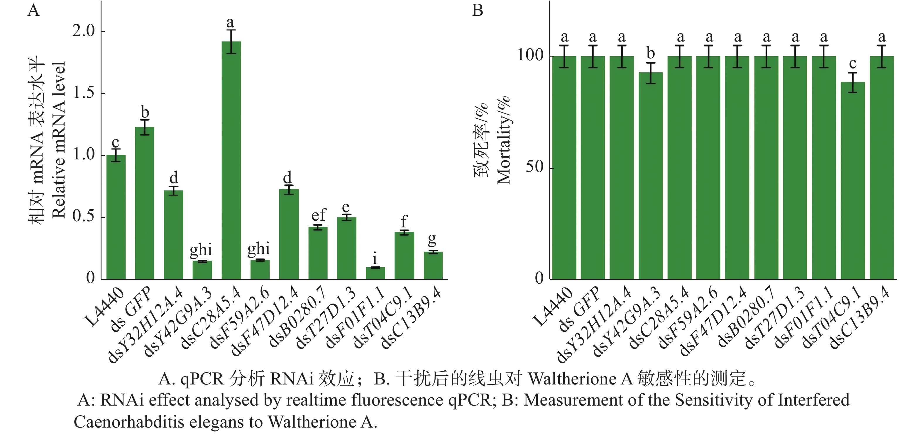 Waltherione A is a plant-derived nematicidal compound with significant activity against root-knot nematodes (LC50 0.09–3.54 mg·L−1). Caenorhabditis elegans was used as a model organism to elucidate the action mechanism of Waltherinone A. Based on a pre-determined screening concentration of 10 mg·L−1, phenotypic differences between wild-type N2 and the Waltherione A-resistant mutant A1 were compared at treatment concentrations of 3 and 6 mg·L−1, enabling a basic phenotypic characterization of the mutant. Systematic screening via SNP mapping and whole-genome resequencing, combined with RNAi validation, identified three potential target genes: Y32H12A.4 (szy-2), F47D12.4 (hmg-1.2), and C28A5.4 (ceh-43). Molecular docking simulations indicated that Waltherione A can form stable, high-affinity complexes with the corresponding proteins (binding energies of −6.3, −7.1, and −6.9 kcal·mol−1, respectively). The results suggest that Waltherione A may exert its nematicidal effect by simultaneously targeting the transcription regulator HMG-1.2, the developmental programming factor CEH-43, and the phosphatase signaling protein SZY-2, thereby disrupting a coordinated response pathway governed by transcriptional and developmental regulation with phosphatase signaling as a key execution node. All these findings systematically reveal the multi-target network of Waltherione A, providing an important theoretical basis for its further development and mechanistic application as a novel green nematicide.