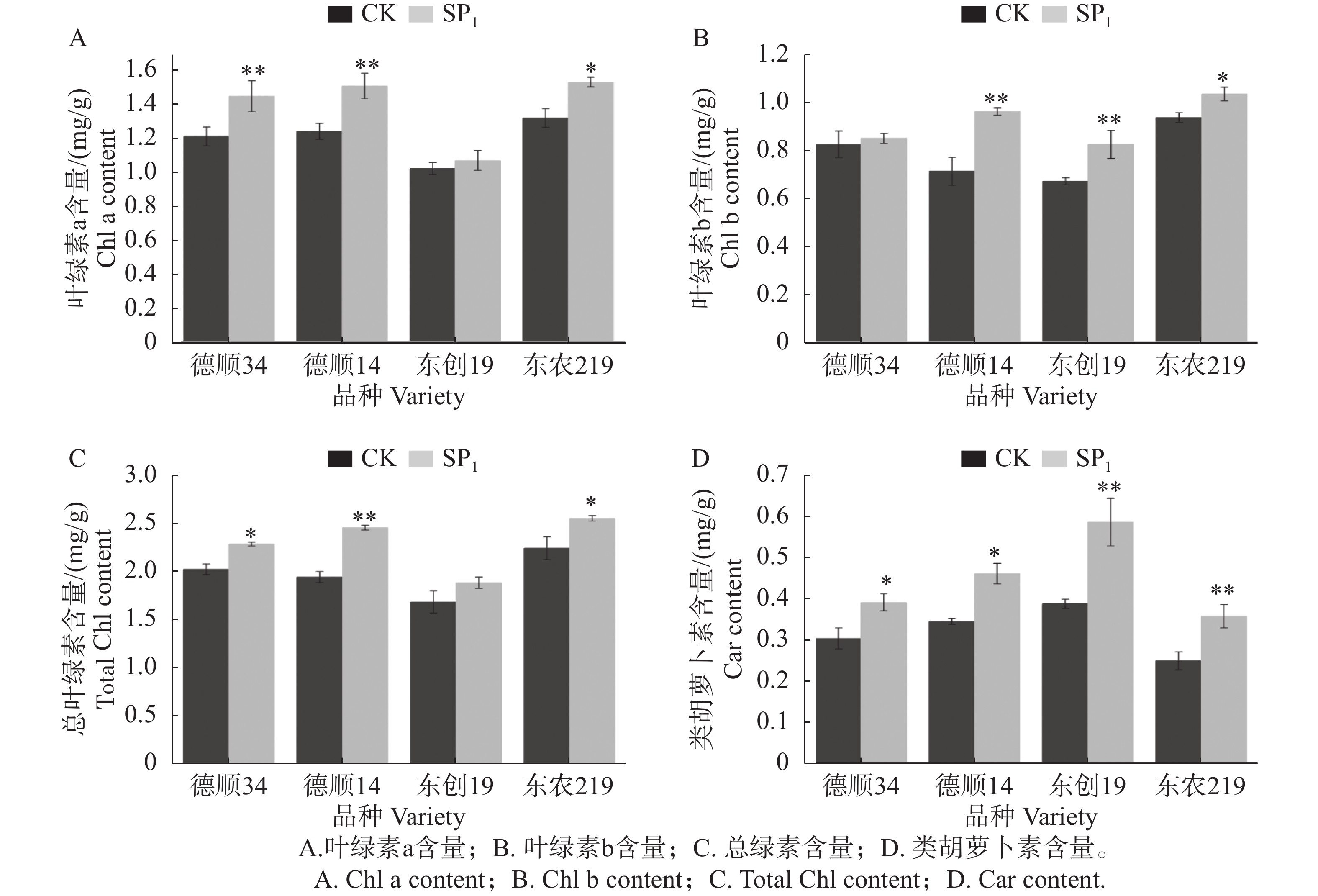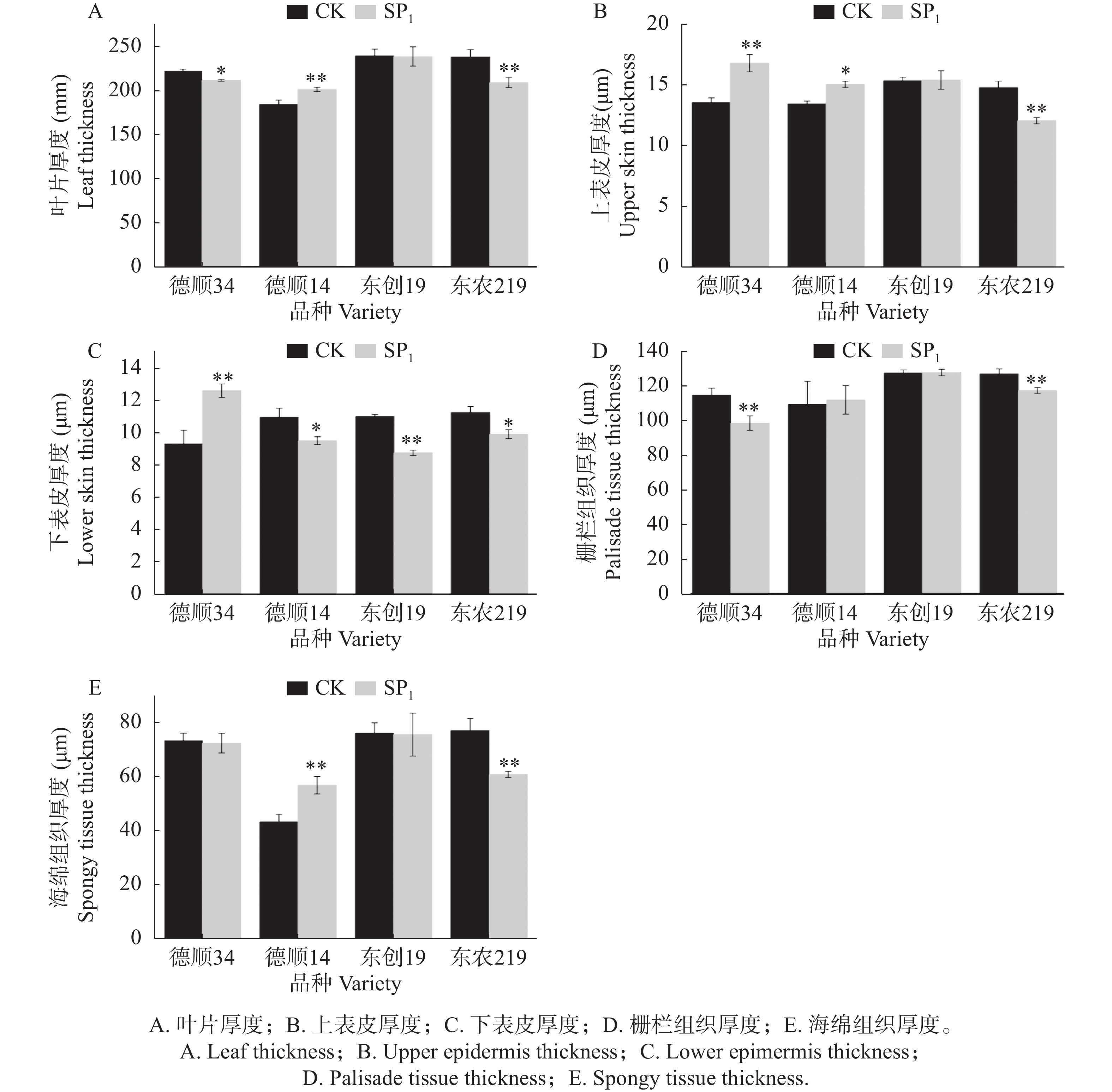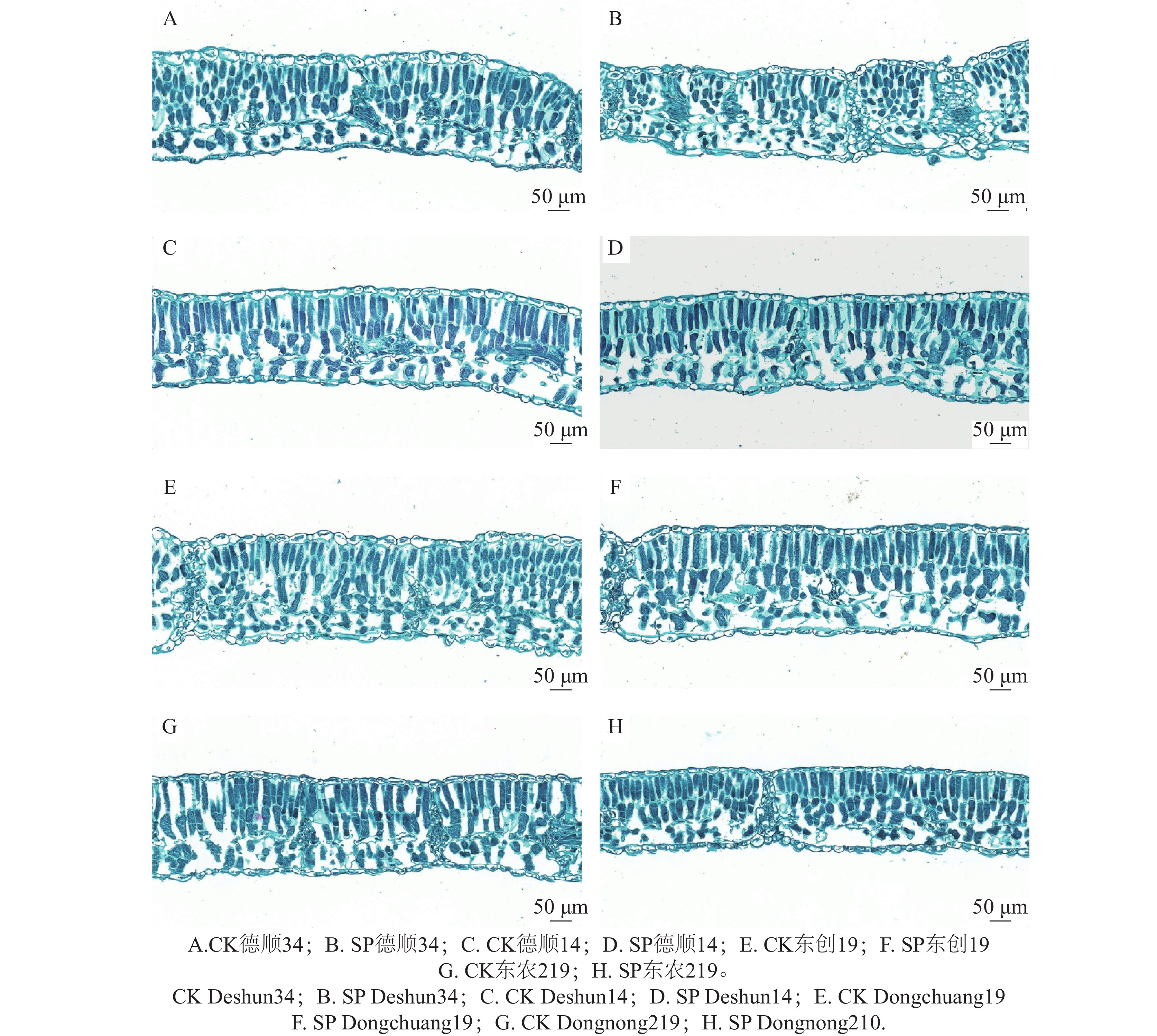 Seeds of four superior soybean varieties carried by the "Shijian-19" satellite were selected for experiment to explore the effects of space mutation on the photosynthetic pigments and microscopic structure of leaves in different soybean varieties. After space mutation treatment, the plants of SP1 generation of these four soybean varieties were planted on the ground. The soybean seeds that were not carried by the satellete were used as the control (CK). The photosynthetic pigments and microscopic structure parameters of the leaves of the soybean plants under space mutation treatment and the control were measured and analyzed. The results showed that the soybean varieties Deshun 34, Deshun 14, and Dongnong 219 under space mutation were 12.91% to 26.38% higher, significantly higher in total chlorophyll content than the control. After space mutation, the carotenoid content of each variety was 28.93% to 51.40% higher, significantly higher than that of the control. After space mutation, the cell morphology, arrangement, and thickness of the leaves of each soybean variety changed significantly. The leaf cells of Deshun 14 were plump, arranged neatly, and had small intercellular spaces. After space mutation, the leaf thickness, spongy tissue thickness, and cell structure compactness of Deshun 14 soybeans were highly significantly higher than those of the control, and the palisade tissue thickness/spongy tissue thickness of Dongnong 219 was highly significantly higher than that of the control, with an increase of 18.52%. However, the cell structure looseness of Deshun 14 and Dongnong 219 was lower than that of the control, decreasing by 10.64% to 18.17%. This experiment provides basic materials for soybean germplasm improvement and variety selection, and offers a foundation and reference for further soybean space mutation breeding and the application of space mutagenesis in the genetic improvement of leguminous crops.