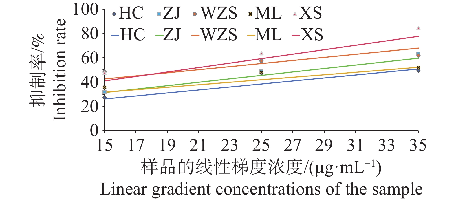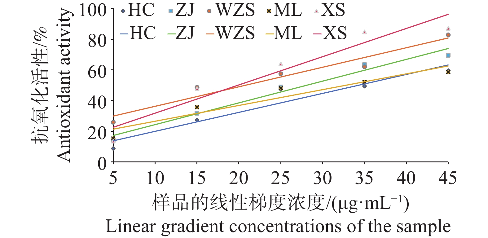 To investigate the differences in antioxidant activities of Camellia vietnamensis seed cake from different producing areas in Hainan Province, seed cake samples were collected from five areas, namely Xisha Township (XS) and Jinbo Township (ML) in Baisha county; Zhongjiu Village (ZJ), Huishan Town in Qionghai city; Shisha Village, Changhao Township in Wuzhishan (WZS); Houchen Coffee Culture Village (HC), Chang’an Village, Fushan Town in Chengmai county, and extracted with ethanol and ethyl acetate to determine their DPPH radical scavenging capacity, ABTS+ free radical inhibitory capacity, and FRAP total reducing activity as well as their total contents of polyphenols, saponins, and polysaccharides. The results showed that the seed cakes from all the five C. vietnamensis producing areas exhibited significant antioxidant activities with obvious geographical differences. The C. vietnamensis seed cake from the HC producing area had the highest antioxidant activity, and its ethanol extract showed the optimal DPPH and ABTS+ free radical scavenging capacity and inhibitory activities, respectively, as well as the highest total phenolic and total saponin contents. The seed cake from the WZS producing area displayed outstanding FRAP total reducing activity. The seed cake from the ML producing area had the lowest antioxidant activities and contents of total phenols and total saponins. The altitude might be the key factor causing the difference between the seed cakes from the ML and HC areas where the soil is red-yellow soil. The ethyl acetate extracts had the slightly lower antioxidant activities than the ethanol extracts. Generally, the ethyl acetate extracts had higher total polyphenol contents but lower total saponin and polysaccharide contents. In summary, the antioxidant activities of the seed cakes were jointly regulated by altitude, soil type, and climatic factors, and the seed cakes from the areas with lower altitude, warm and moist climate, yellow-red soil seems to have the highest antioxidant activity. These findings provide a theoretical basis for the rational cultivation of C. vietnamensis in Hainan province, and the resource utilization of seed cake by-products to improve the camellia industrial chain, and they also lay a foundation for further research on the antioxidant mechanism of bio-active components and the synergistic or antagonistic effects among components.