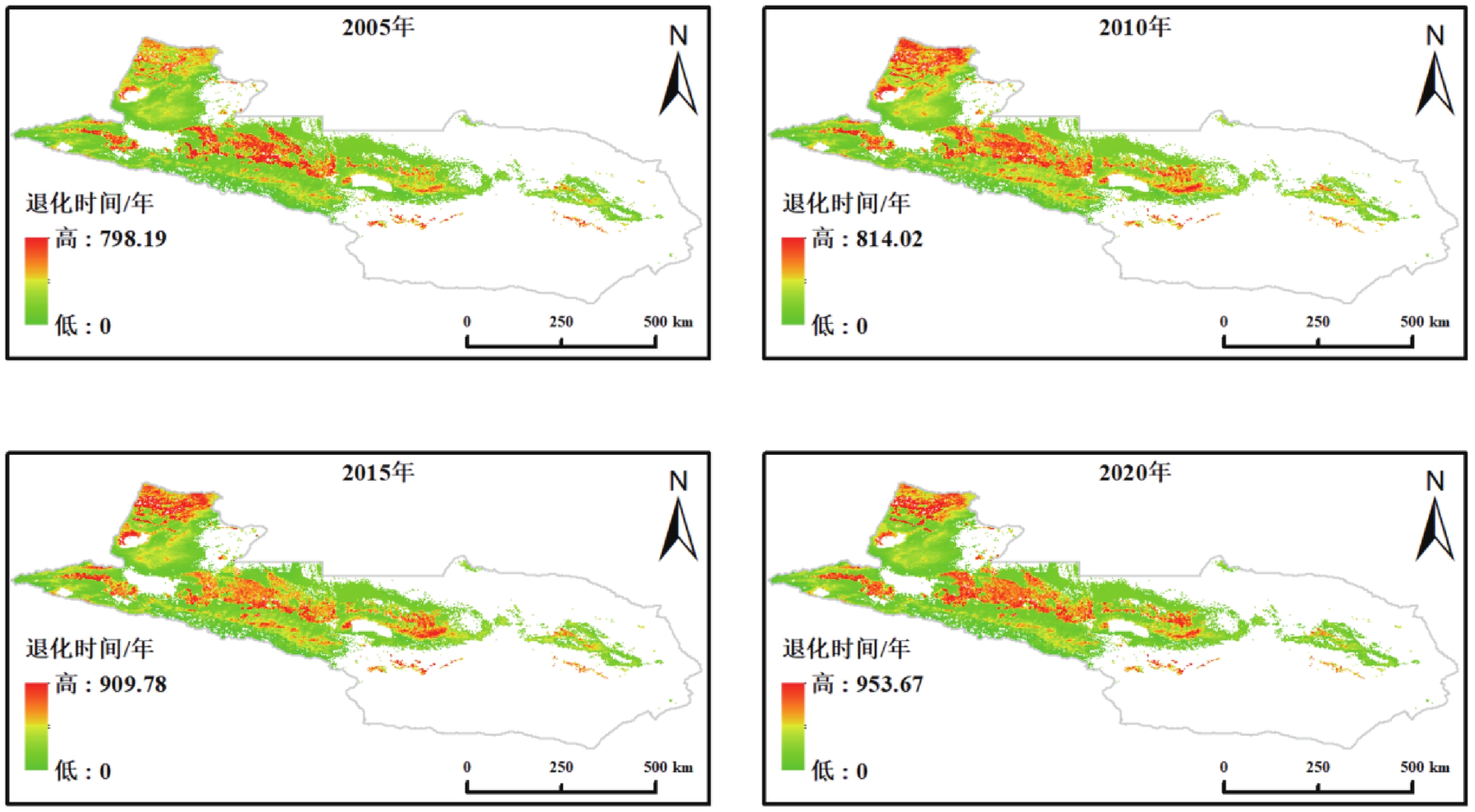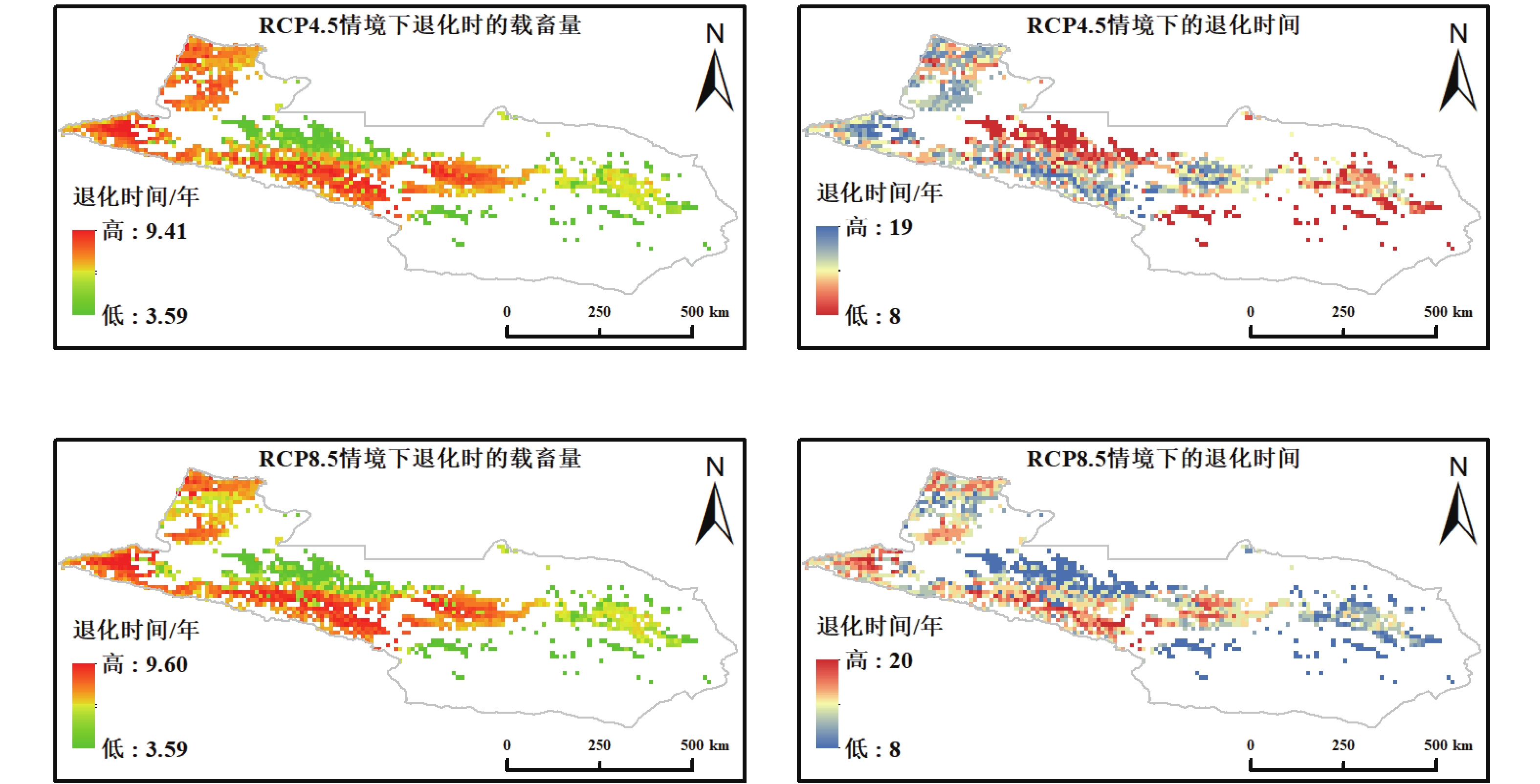 Grassland ecosystems are an important component of terrestrial ecosystems and play a critical role in maintaining ecological security and supporting livestock production. Due to climate warming and overgrazing, grassland productivity has declined, increasing the risk of ecological degradation. Existing studies on grazing intensity and grazing thresholds largely rely on empirical or static data, making it difficult to capture the dynamic changes of grasslands under grazing pressure. This study takes the grasslands on the northern Tianshan Mountains as an example, using LAI time series unaffected by grazing to simulate ungrazed growth trajectories and applying a light-use efficiency model to calculate ungrazed net primary productivity (NPP). Based on this, a grazing threshold model was established using ungrazed NPP to describe degradation time and threshold distribution under different grazing pressures. The results show that the spatial distribution of ungrazed NPP exhibits a “higher in the west and in mountainous areas, lower in the east and on plains” pattern. Under current stocking rates and scenarios with 10% and 30% reduced grazing, grassland degradation generally occurs within 1–18 years, with some areas reaching a critical stocking rate of zero, indicating that current grazing pressure has reached or exceeded the ecological carrying limit. As stocking rates decrease, the time for some pixels to reach the degradation threshold is significantly delayed, suggesting that moderate grazing reduction can locally postpone grassland degradation. Under the RCP4.5 and RCP8.5 scenarios, the critical stocking rate ranges from 3.59 to 9.60 SU/ha, with limited overall differences in grazing thresholds and degradation time, but notable regional variability. The proposed ungrazed NPP–based grazing threshold simulation approach provides a scientific basis for quantitatively identifying grassland ecological carrying capacity and supporting differentiated grazing management strategies.