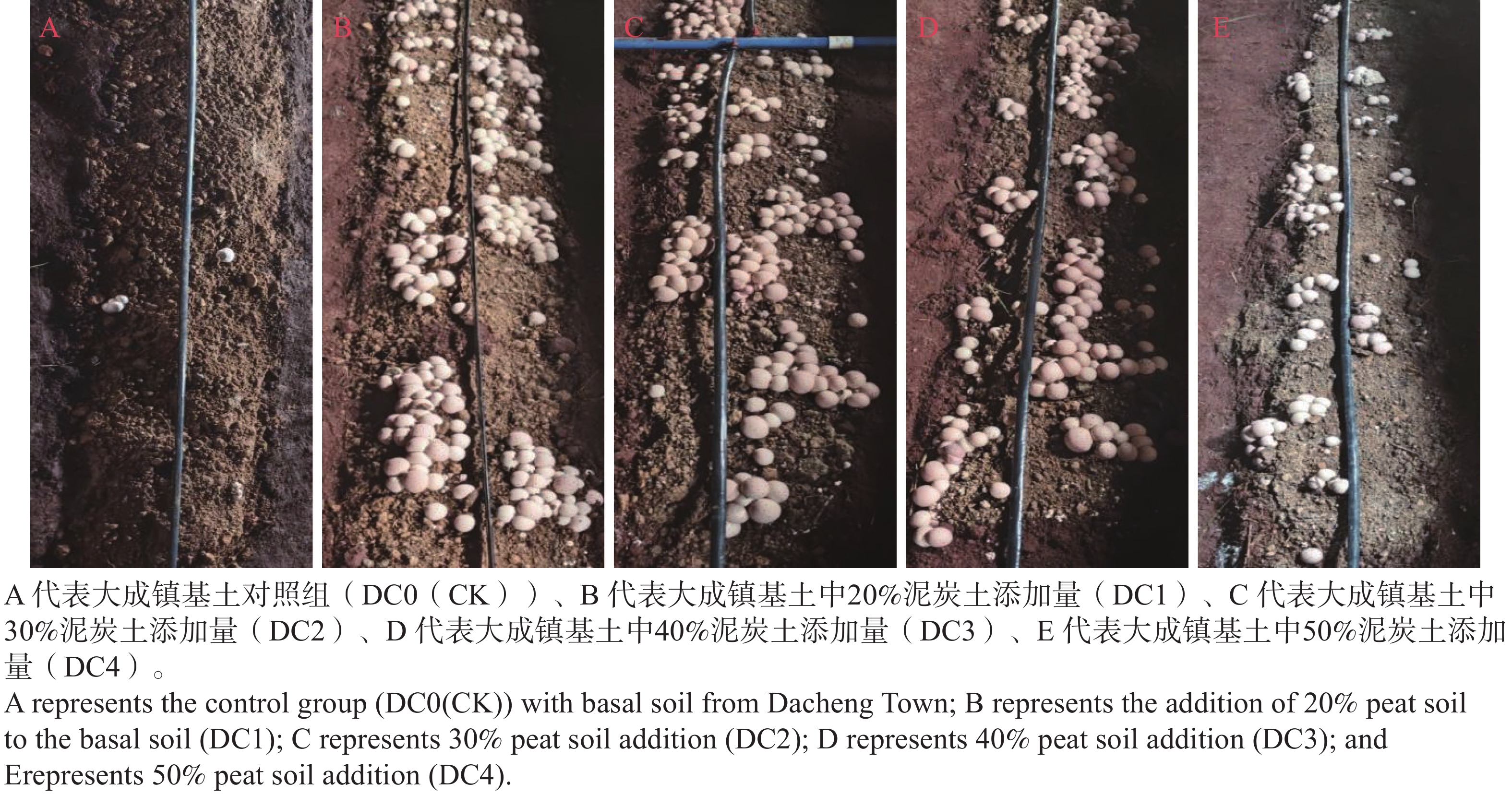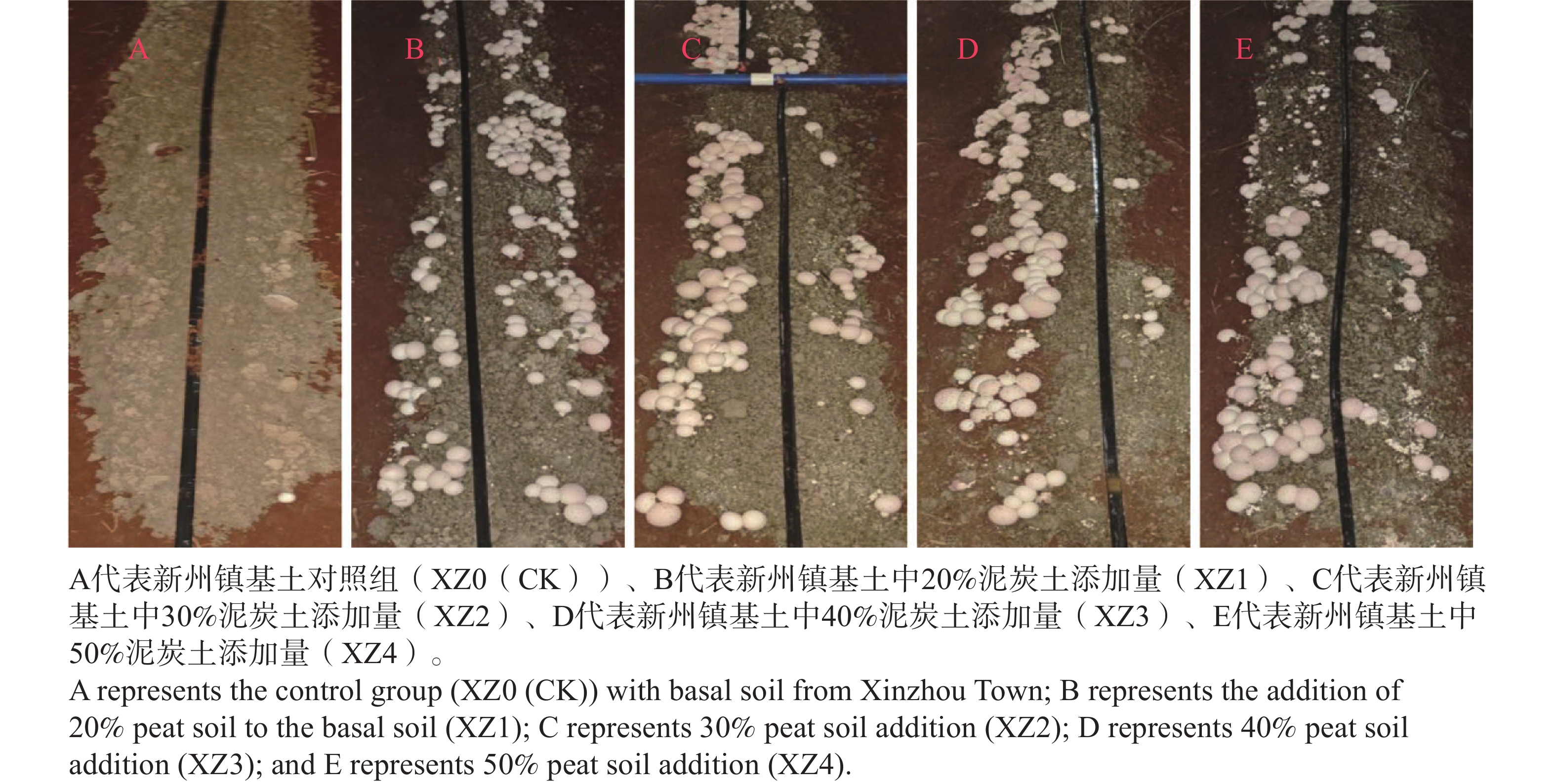 To address the issues of high cost and low yield in the cultivation of Dictyophora rubrovolvata in Hainan, this study conducted a gradient experiment to optimize the mushroom-stick substrate and casing soil composition. Key parameters, including mycelial growth rate, bag-filling time, primordia formation time, fruiting time, fruiting body morphological characteristics, and yield, were measured to evaluate the effects of different carbon sources, nitrogen sources, and organic matter on the growth of D. rubrovolvata. The results indicated that the A5 substrates formula, containing rubberwood as the carbon source and soybean as the nitrogen source, exhibited the best performance. It achieved a mycelial growth rate of 12.62 mm·d-1, a bag-filling time of 16.33 d, and produced dense, robust, and pure white mycelia. The addition of sphagnum peat to the casing soil at varying ratios enhanced mycelial growth, shortened the time to primordia formation and fruiting, and increased yield. Specifically, the highest yield per stick (93.76 g) were achieved with the application of 20% peat to the base soil from Guangcun Town. The application of 30% peat to the base soil from Dacheng Town resulted in the highest yield per stick (103.58 g) and. Similarly, the addition of 30% peat to the Xinzhou Town base soil yielded at 92.66 g per stick This study provides a theoretical basis and technical support for the efficient and low-cost cultivation of D. rubrovolvata in tropical regions.