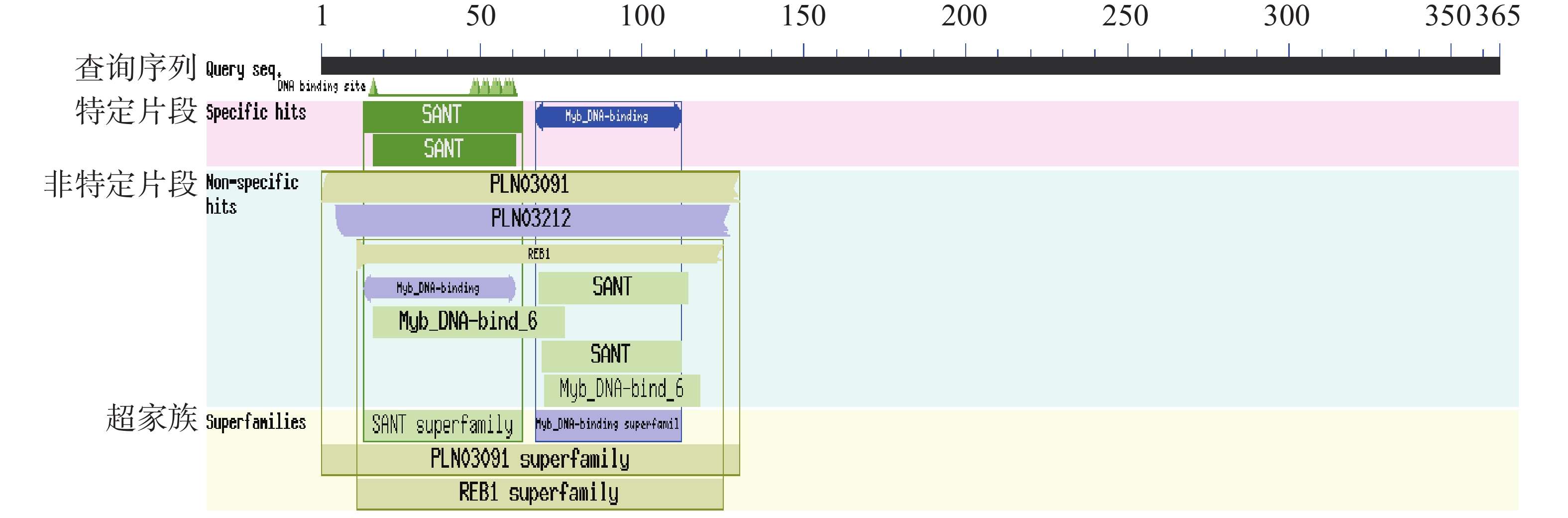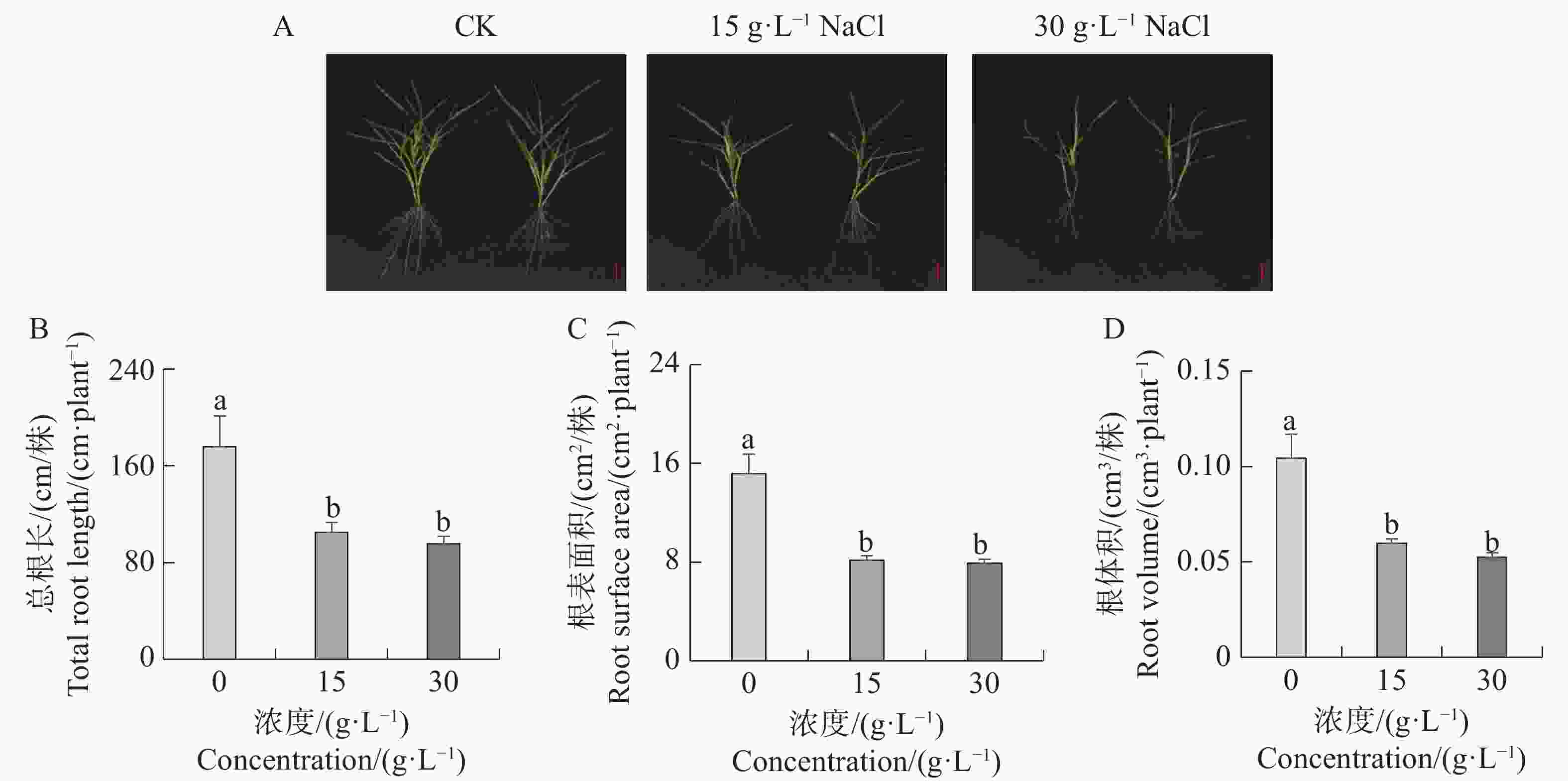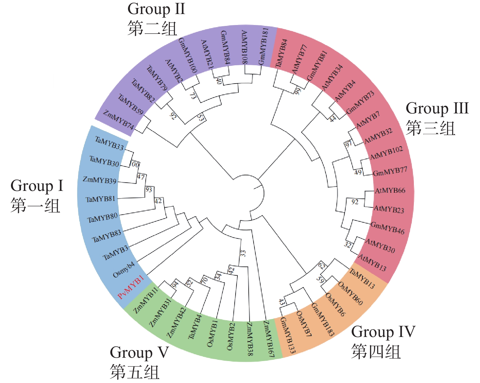 为探究MYB转录因子基因是否参与了盐胁迫下对海雀稗(Paspalum vaginatum Sw.)生长发育的调控,本研究分析了盐胁迫对海雀稗生长的影响,克隆了PvMYB1基因,通过生物信息学及基因表达两种分析方法展开研究。结果表明:盐胁迫抑制了海雀稗地上部和根系生长,具体表现为总根长、根表面积及根体积的降低。海雀稗PvMYB1基因全长为1 098 bp,编码365个氨基酸残基,蛋白分子量为 39.26 kDa,属于R2R3-MYB家族,亚细胞定位预测 PvMYB1蛋白定位于细胞核中。实时荧光定量PCR结果显示,PvMYB1基因在叶中的表达量高于在根中的表达量;不同时段NaCl处理结果显示,30 g·L−1 NaCl处理显著提升了PvMYB1基因的转录水平。此外,在不同NaCl浓度处理的条件下,在NaCl浓度升至15 g·L−1时,根和叶中的PvMYB1基因的表达量显著上调。本研究结果揭示了PvMYB1可能参与了海雀稗对NaCl胁迫的应答。
