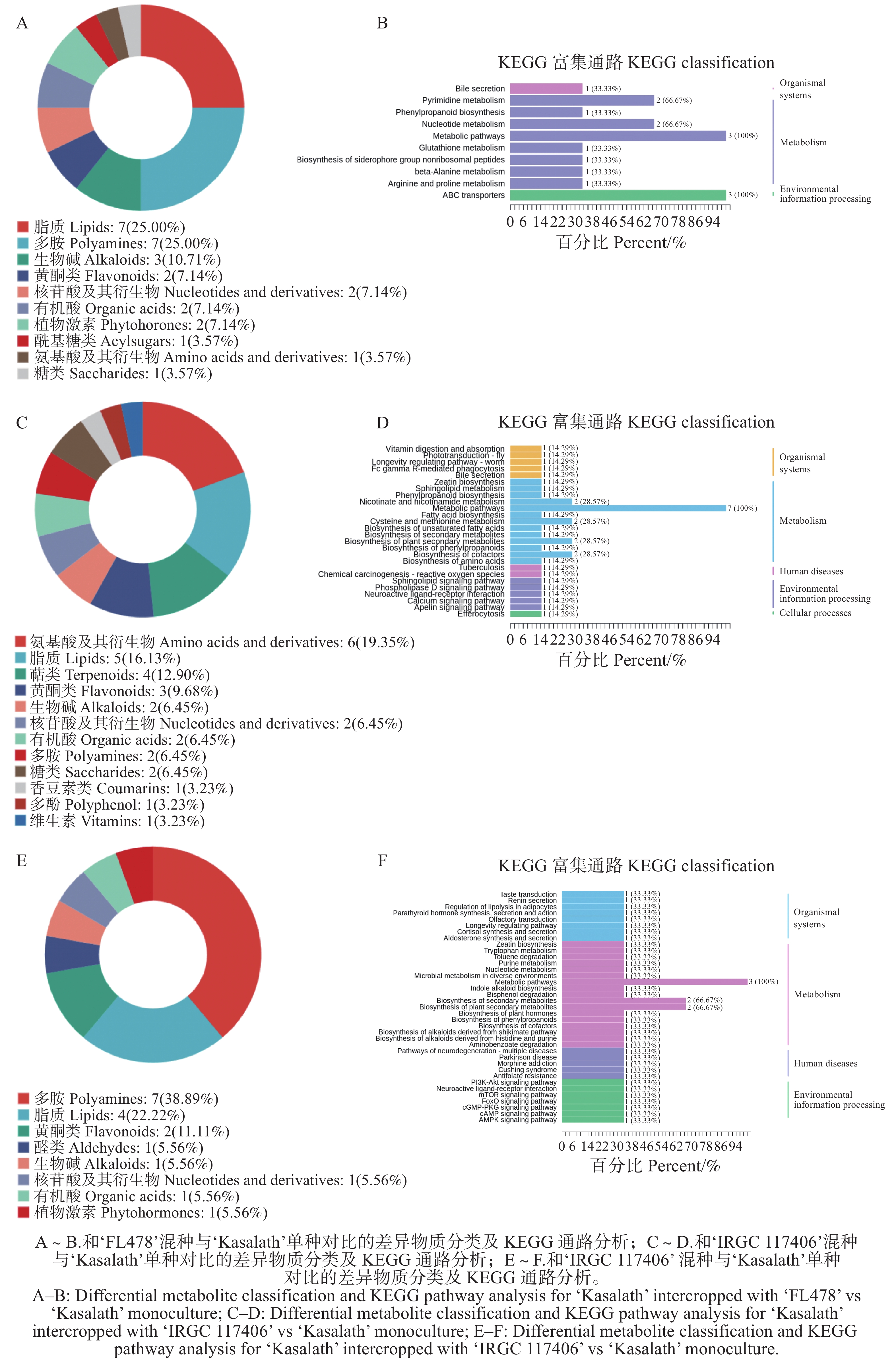 水稻(Oryza sativa)品种在幼苗期的根际互作对群体结构建成与资源获取具有重要影响,为了探究其化学生态机制,在可控条件下,通过配对混种试验,比较了‘Kasalath’与‘FL478’、‘IRGC126961 ’、‘IRGC 117406 ’的根系互作效应,系统分析了根系形态差异及根系分泌物代谢特征。结果表明,混种条件下‘Kasalath’根系生长保持稳定,而3个伴生品种的根面积与最大根长均受到显著抑制,降幅达 30%~46%,呈现出明显的非对称抑制效应。代谢组学共鉴定到 1 307 种代谢物,受抑制品种在混种后均发生显著代谢重构,主要涉及脂类、氨基酸衍生物、黄酮类及多胺类等代谢途径。尽管‘Kasalath’表型稳定,但其代谢谱在不同混种组合中仍发生特异性变化,涉及核苷酸代谢、苯丙烷代谢和谷胱甘肽代谢等通路。综合表型与代谢组数据可知,‘Kasalath’通过较强的根际竞争能力与代谢稳态维持机制抑制伴生品种根系生长,而伴生品种代谢补偿能力不足,导致生长受抑。