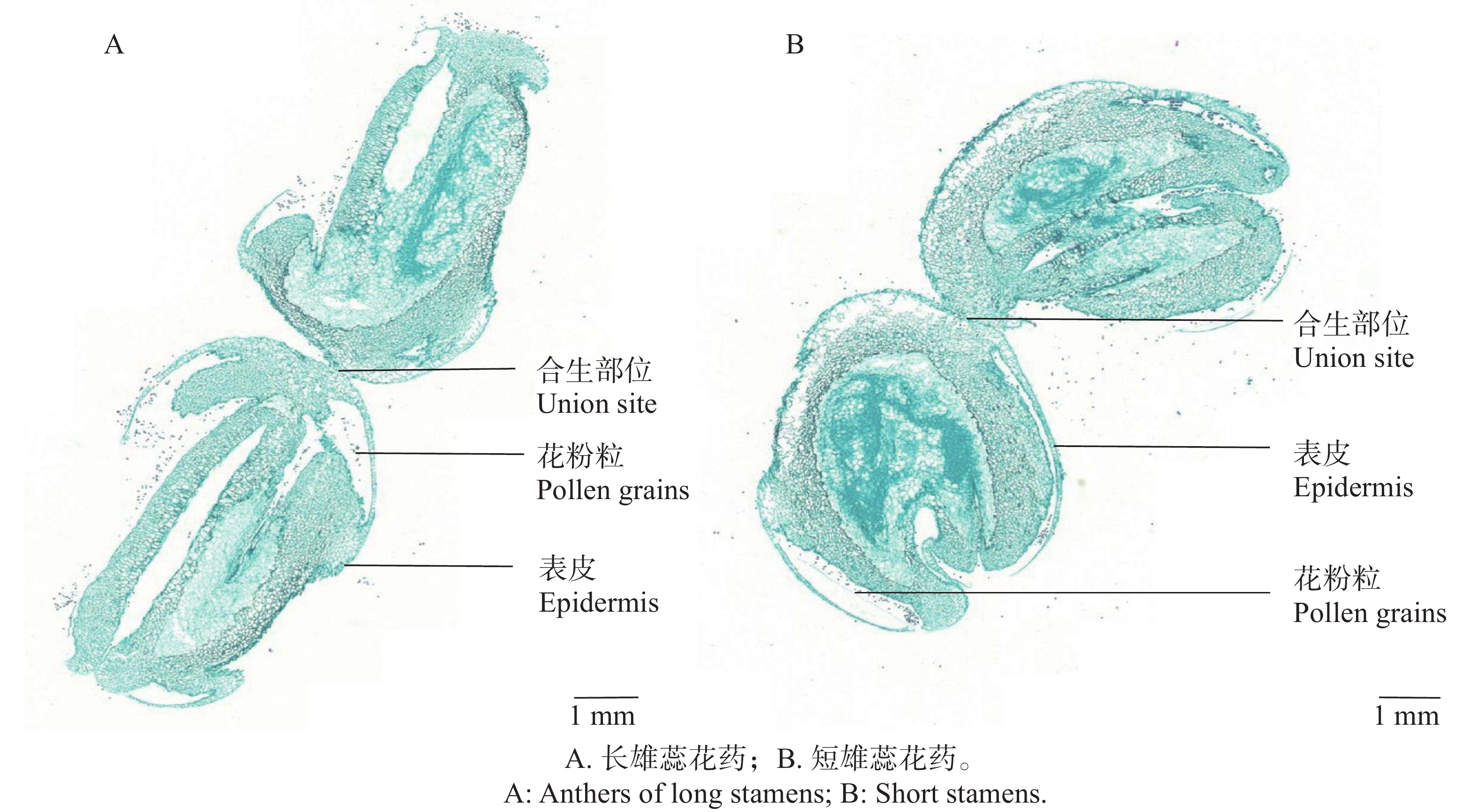 为探究鸟媒传粉植物红花芒毛苣苔(Aeschynanthus moningeriae)合生花药的传粉适应意义,研究了海南五指山分布的红花芒毛苣苔种群开花生物学、合生花药的发育过程与力学特性及其对传粉过程的影响。结果表明:1)红花芒毛苣苔二强雄蕊的一长一短2对花药的顶端在花蕾期就已呈黏合状态,并在整个花期发育过程中保持合生状态;长、短雄蕊的合生花药最终分别形成约180°(平行)和115°(倒“V”型)的角度。2)短雄蕊的花药合生程度更大,合生力学强度在向上(F=0.159±0.031N)、向下(F=0.211±0.034N)方向上都显著高于长雄蕊合生花药(向上:F=0.127±0.020 N;向下:F=0.117±0.018 N)。3)叉尾太阳鸟(Aethopyga latouchii)是其唯一有效传粉者,对红花芒毛苣苔红色花冠及裂片上的黑色条纹(蜜导)敏感;长雄蕊和短雄蕊的合生花药主要分别接触鸟的额头和鸟喙基部,在鸟类头部形成更大范围的花粉沉积区,从而提高了后续访花过程柱头接受花粉的概率。由于访花时鸟喙基部的冲击力较大,短雄蕊更强的合生程度和强度可以保持花药合生状态,维持花药相对稳定的位置和促进花粉输出。