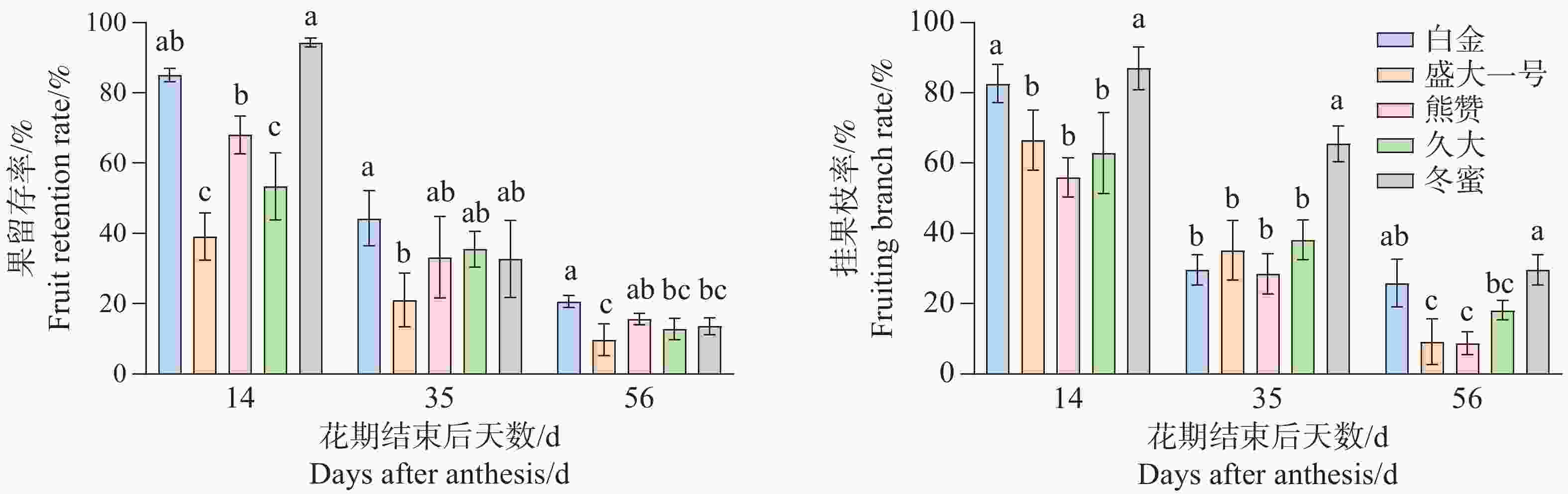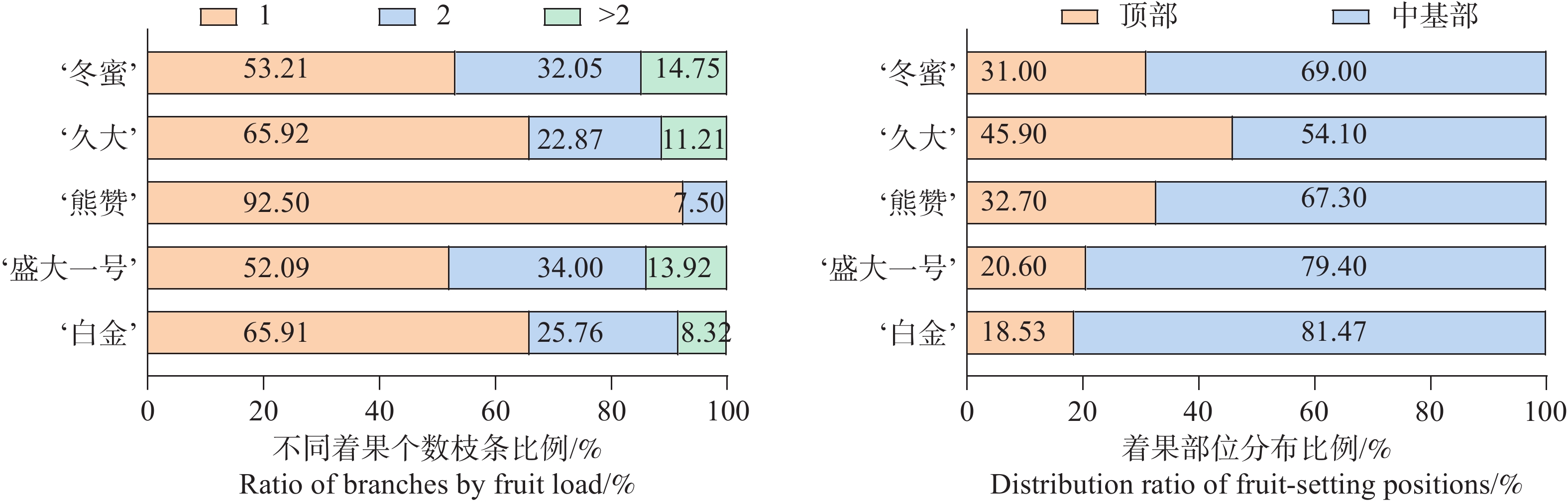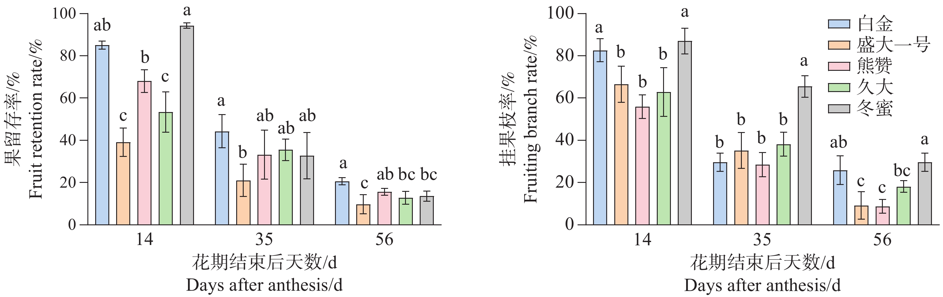 黄晶果(Pouteria caimito)属山榄科桃榄属常绿乔木,具有较高的种植效益,但在自然状态下落果现象较为严重,极大影响了黄晶果经济效益。本研究通过调查‘白金’、‘盛大一号’、‘熊赞’、‘久大’和‘冬蜜’等品种黄晶果的着果特性,结果发现,黄晶果果实发育的各阶段均存在较为严重的落果,且每结果枝成熟果实着果个数多为1~2个,着果部位多位于枝条的中基部。以‘冬蜜’和‘白金’为试验对象,根据黄晶果着果特性进行疏果处理,试验设置3个留果量,分别为每结果枝留1个果(T1)、2个果(T2)和3个果(T3),通过测定枝条着果个数、果实生长动态和果实品质等指标,综合评估黄晶果的最佳留果量。结果显示,留果量的减少可以提高黄晶果的着果个数,且T1处理组的挂果枝率和成熟果数量显著高于T2和T3处理组。果实动态发育测量显示,随着留果量的增加,果实纵横径的生长速率逐渐较小,但对果形指数影响不大。单果质量、可食率和可溶性固形物随着留果量的增加而减少,且T1和T2处理组的固酸比显著高于T3处理组。因此,合适的留果量可以减少果实发育过程中的落果,随着留果量的减少可显著提高黄晶果的着果个数和果实发育速率,以每结果枝留1个果实的单果质量较大,可食率和可溶性固形物含量高,品质最佳。