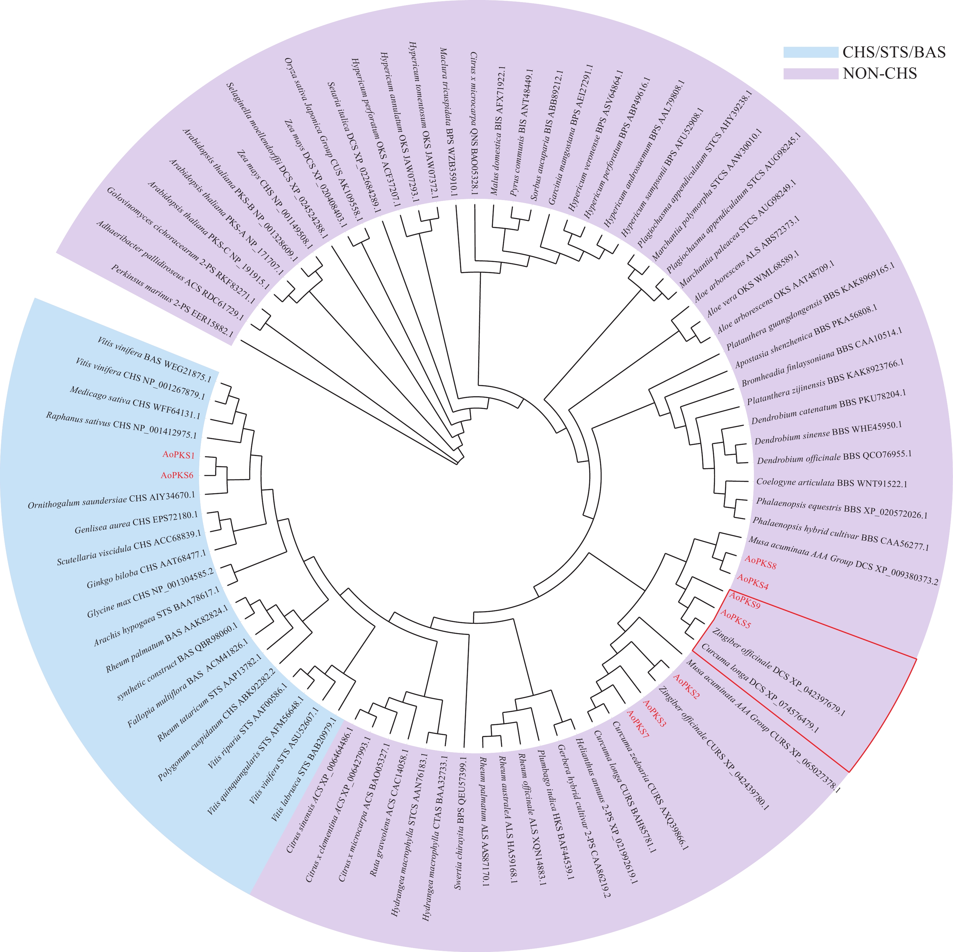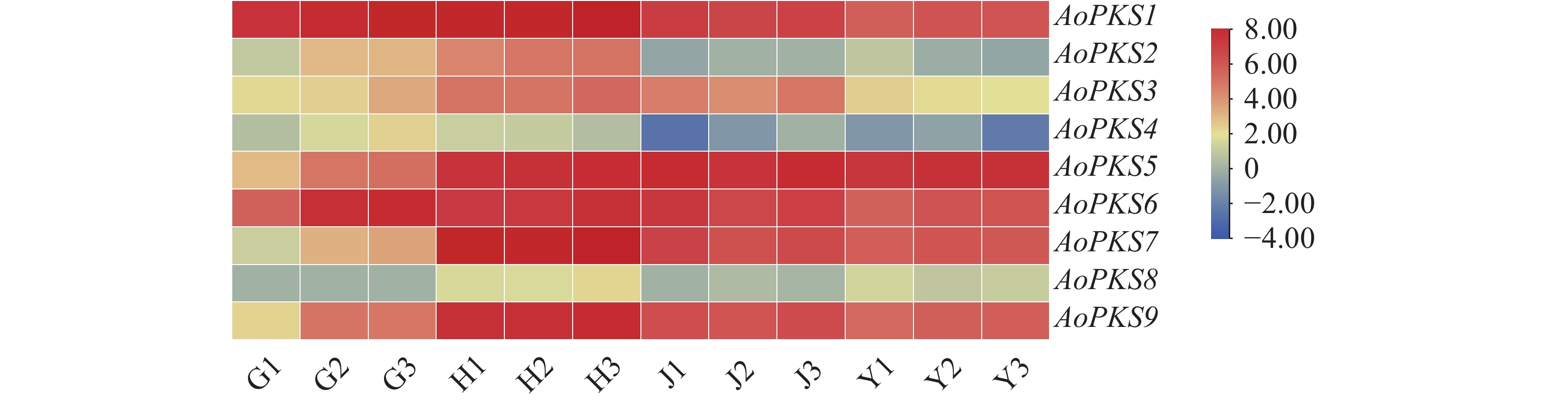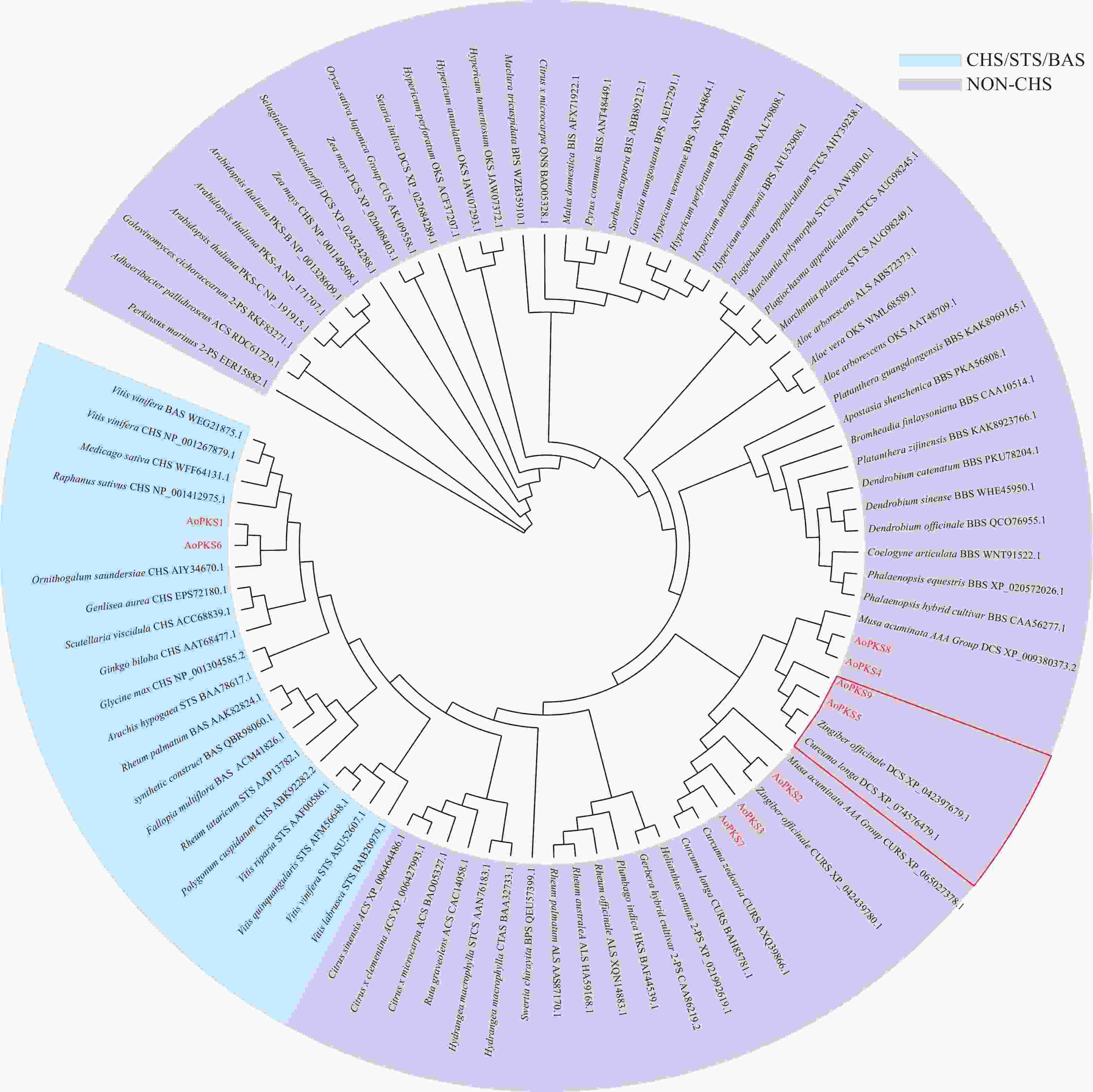 An analysis was made of the molecular characteristics of type III polyketide synthases (PKSIII) in Alpinia oxyphylla and their potential role in the biosynthesis of diphenylheptanoid compounds. The PKSIII gene family was identified from the A. oxyphylla genome, and the candidate gene AoPKS5 was selected for structural and expression analysis. Based on genomic and transcriptomic data, PKSIII genes were systematically screened and analyzed for expression levels, and phylogenetic analysis was conducted to explore their evolutionary relationships. Bioinformatics tools were used to predict the physicochemical properties and catalytic sites of AoPKS5. Tissue-specific expression was analyzed by using RT-qPCR, and the recombinant vector pNC-ET28-AoPKS5 was constructed for heterologous expression in Escherichia coli BL21 (DE3). The results showed that AoPKS5 contained a