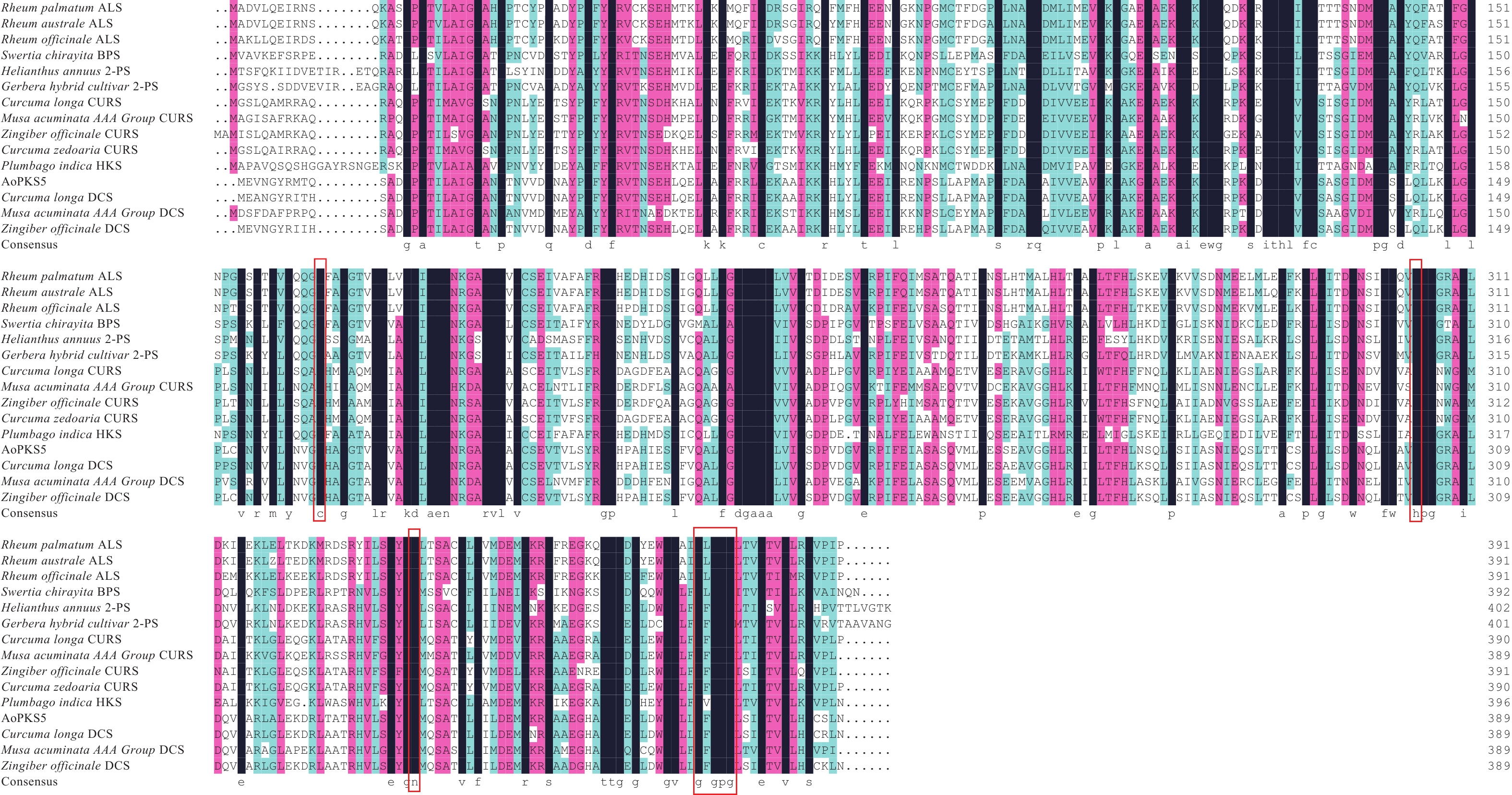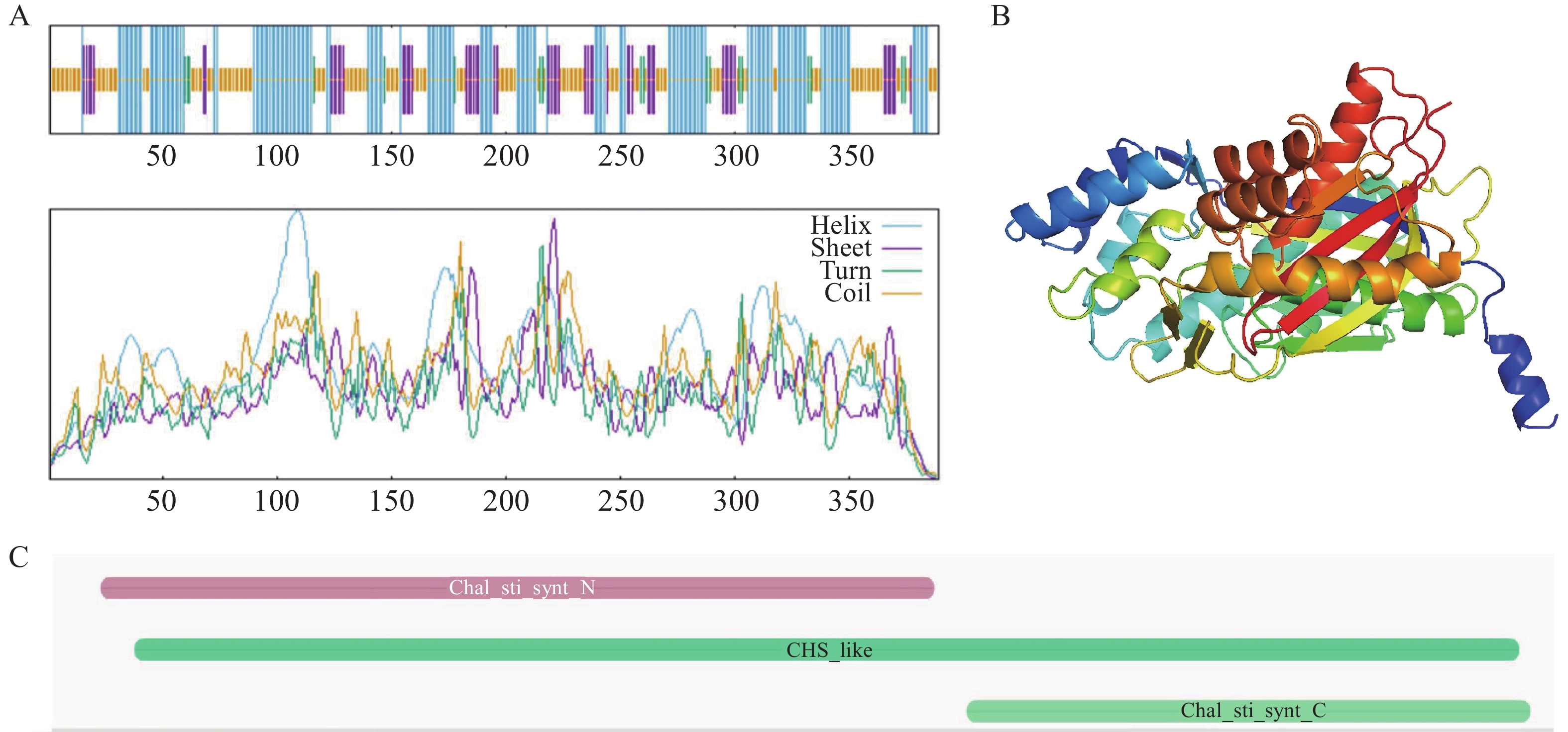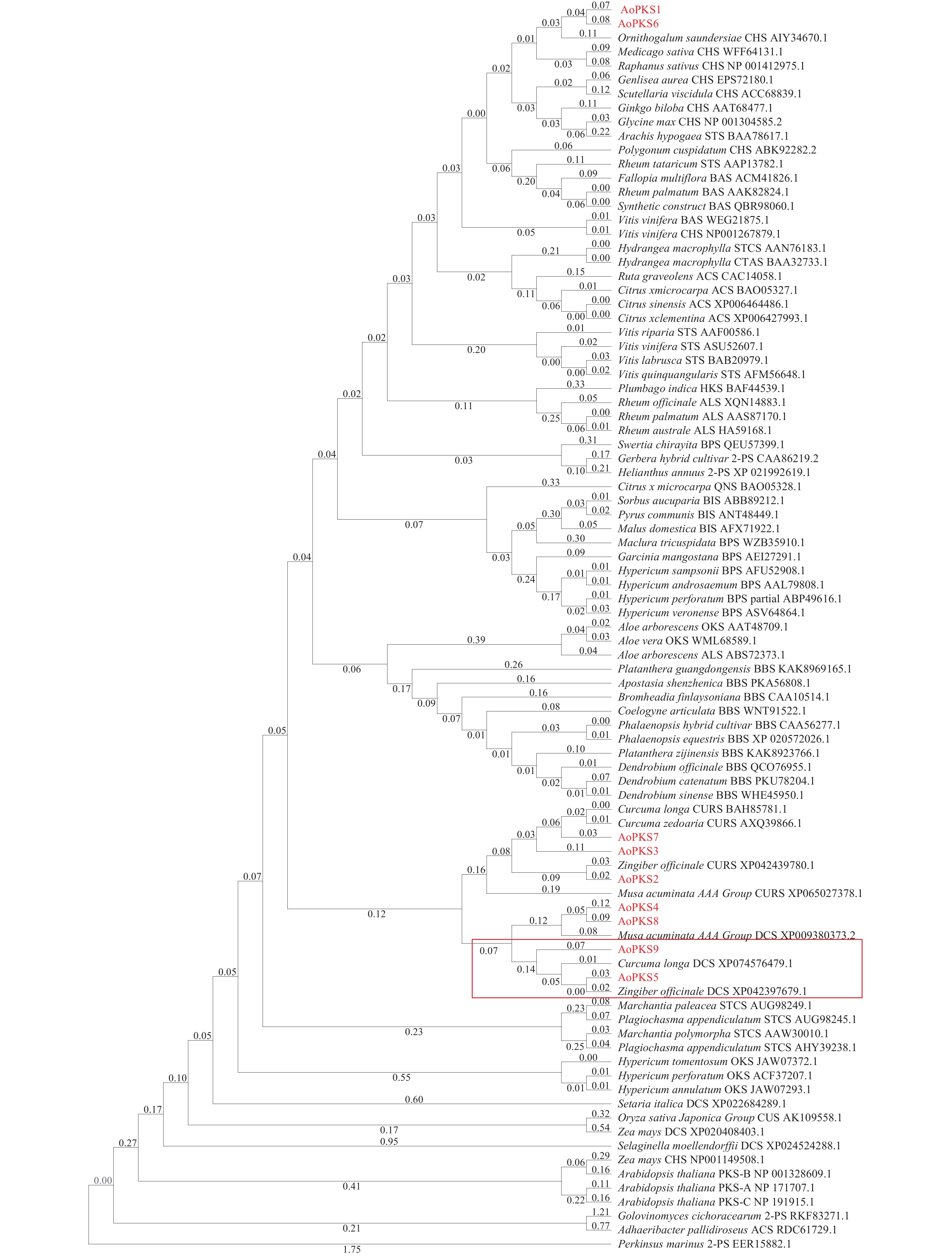 An analysis was made of the molecular characteristics of type III polyketide synthases (PKSIII) in Alpinia oxyphylla and their potential role in the biosynthesis of diphenylheptanoid compounds. The PKSIII gene family was identified from the A. oxyphylla genome, and the candidate gene AoPKS5 was selected for structural and expression analysis. Based on genomic and transcriptomic data, PKSIII genes were systematically screened and analyzed for expression levels, and phylogenetic analysis was conducted to explore their evolutionary relationships. Bioinformatics tools were used to predict the physicochemical properties and catalytic sites of AoPKS5. Tissue-specific expression was analyzed by using RT-qPCR, and the recombinant vector pNC-ET28-AoPKS5 was constructed for heterologous expression in Escherichia coli BL21 (DE3). The results showed that AoPKS5 contained a